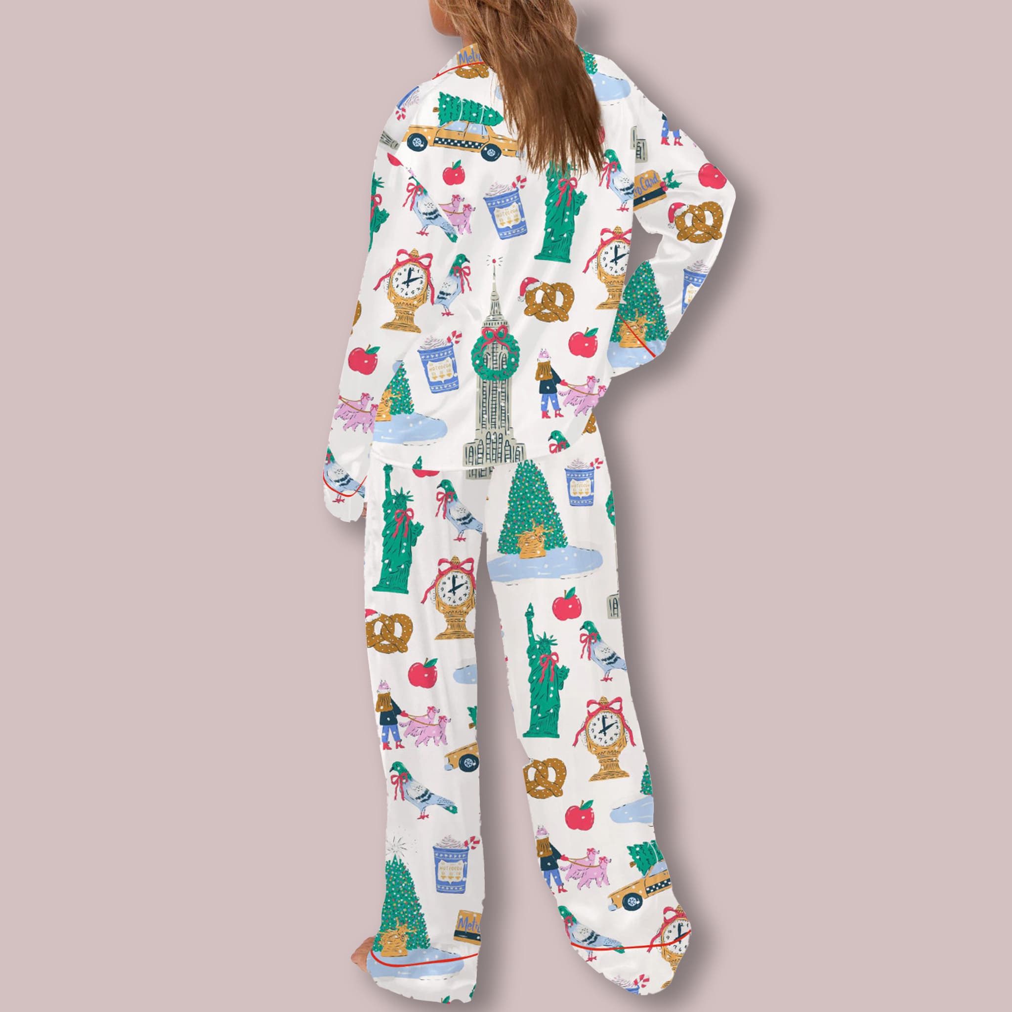 Crafted from a premium, silky-soft fabric, these pajamas offer a luxurious feel that is perfect for lounging after a long day of holiday shopping or waking up late on a snowy morning.The New York City Women’s Pajama Set against a crisp white background, the print features a playful and colorful collage of NYC’s most famous landmarks and winter treats. The whimsical illustrations include yellow taxis carrying Christmas trees, the Statue of Liberty adorned with a festive bow, soft pretzels, and the Empire State Building.