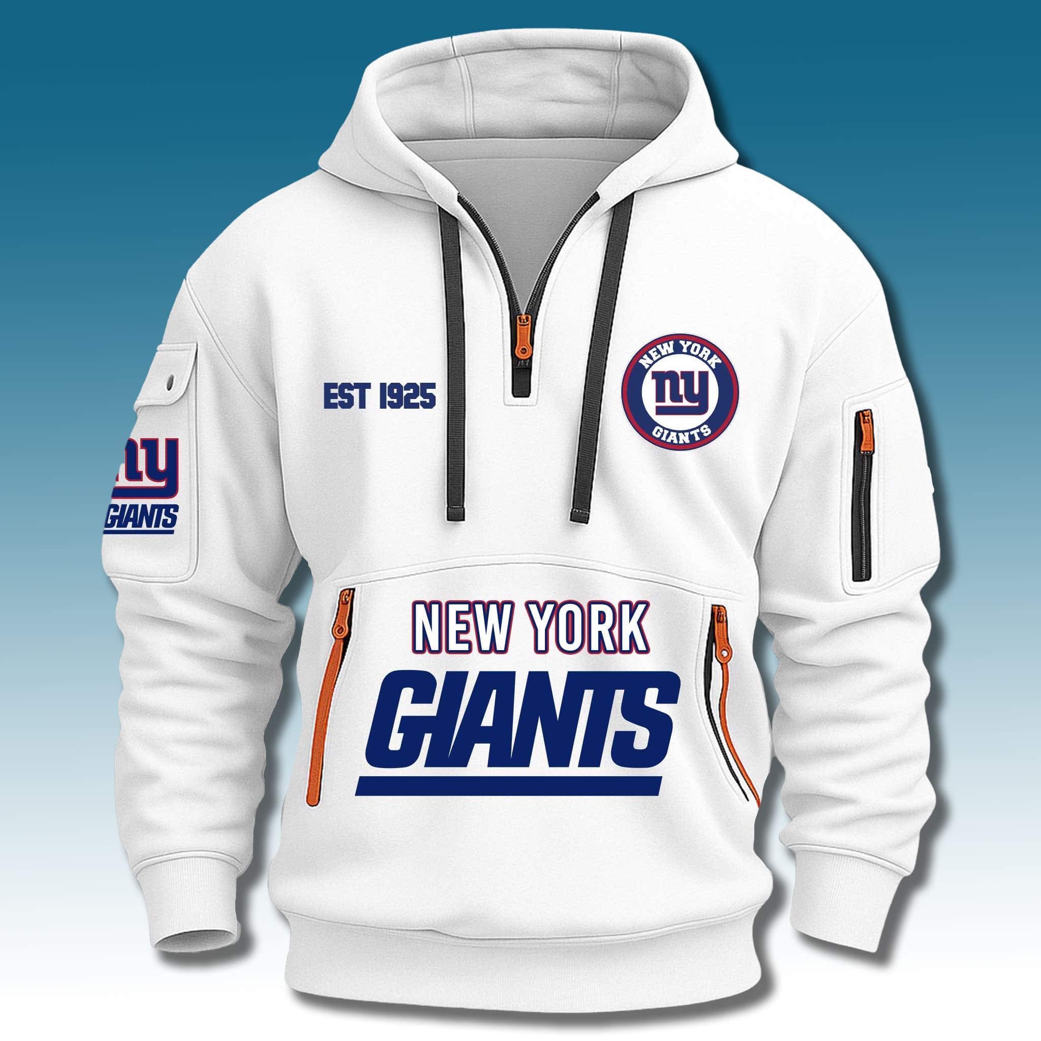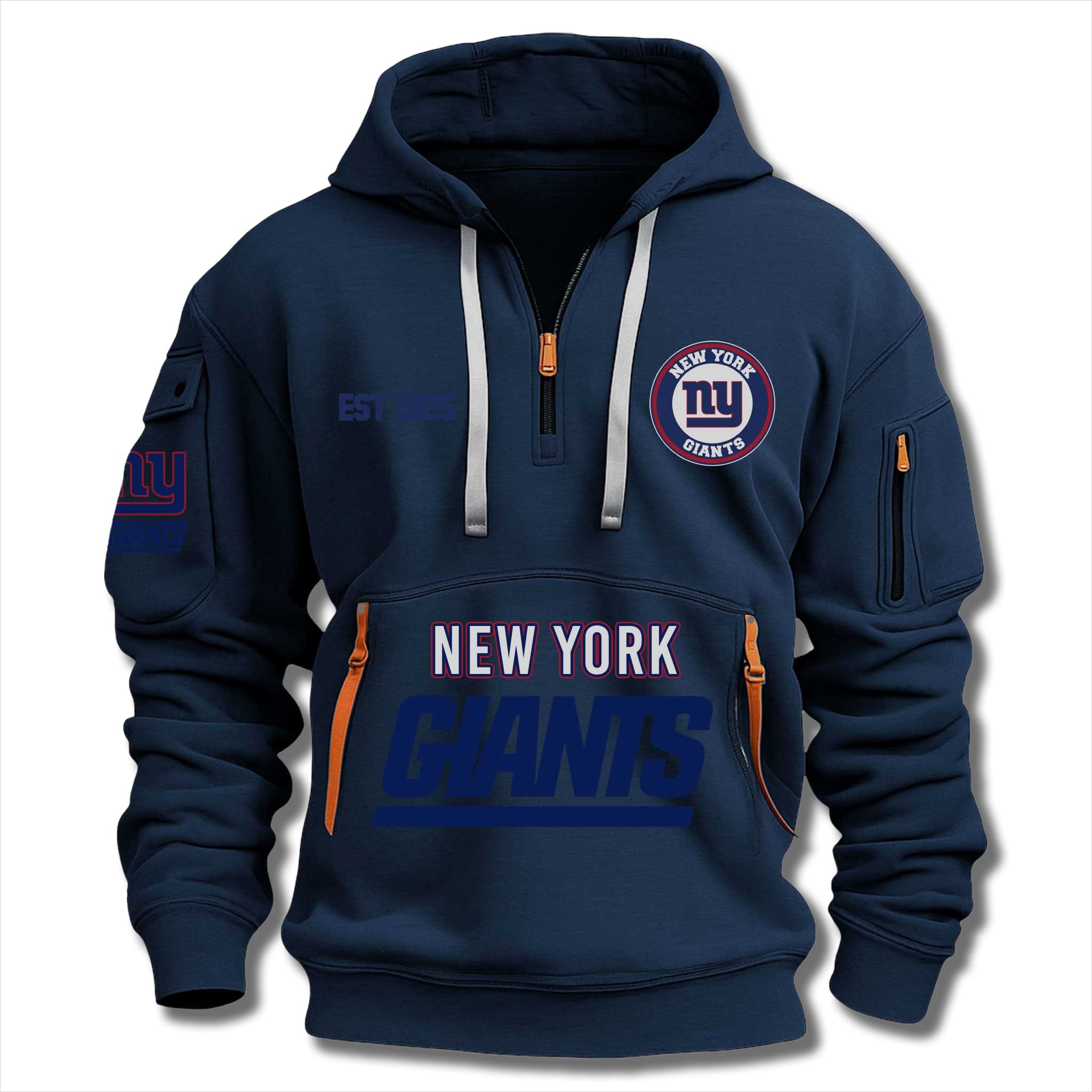 The Giants EST 1925 Quarter Zip Hoodie is a true icon for Giants fans, honoring the year 1925. As the oldest team in the Northeastern United States, with eight league championships including four SB titles (1987, 1991, 2008, 2012), this hoodie captures the fiery spirit of the Big Blue Wrecking Crew – from the early Polo Grounds era to the relentless journeys of legends like Frank Gifford and Eli Manning.