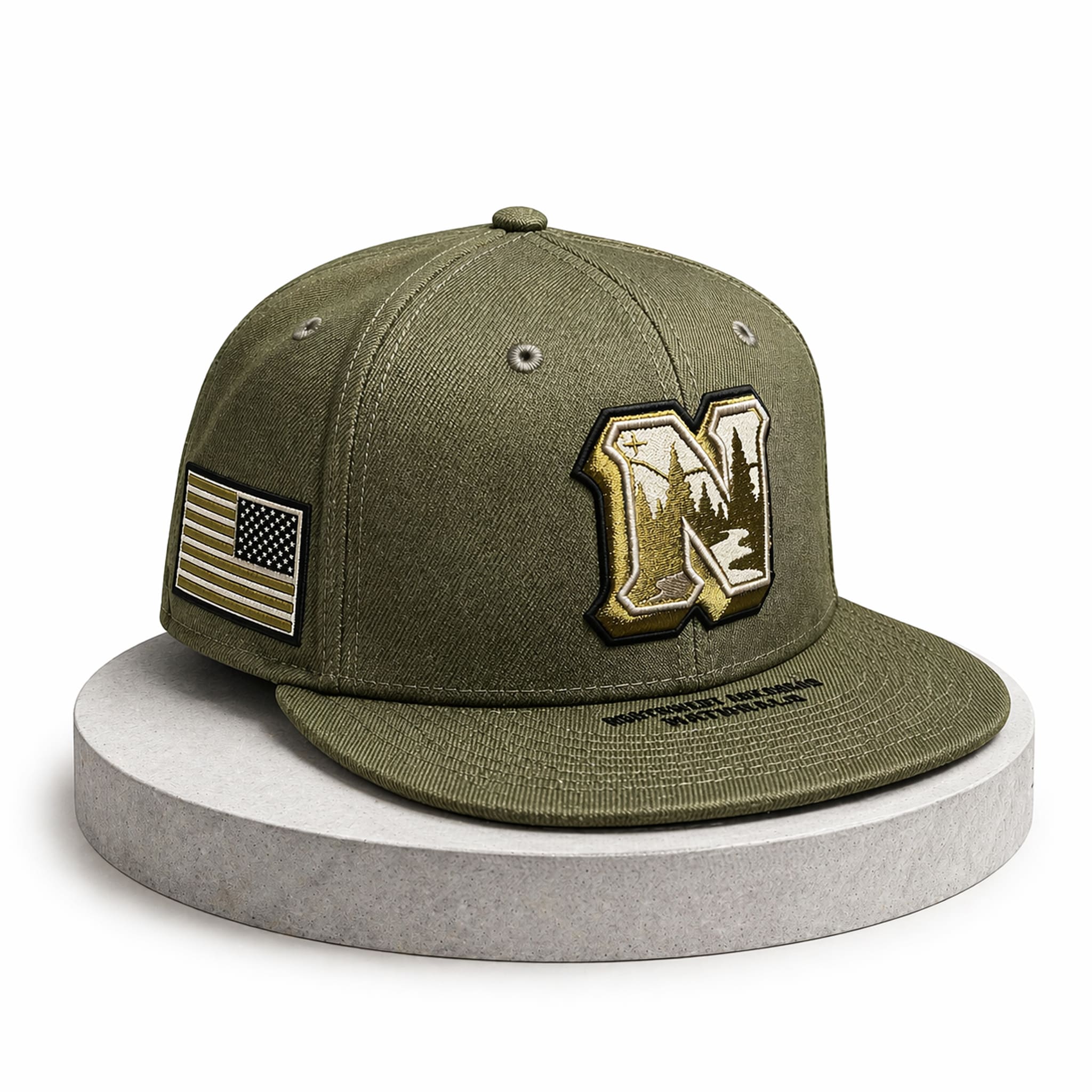 This hat features a signature Olive green tone, serving as the backdrop for an exquisitely embroidered logo featuring a pine forest landscape inside. This detail not only asserts the team brand but also evokes the persistence of old pine trees against the wind, paired with a sharp American flag patch embroidered on the side to create an extremely impressive tactical style.
