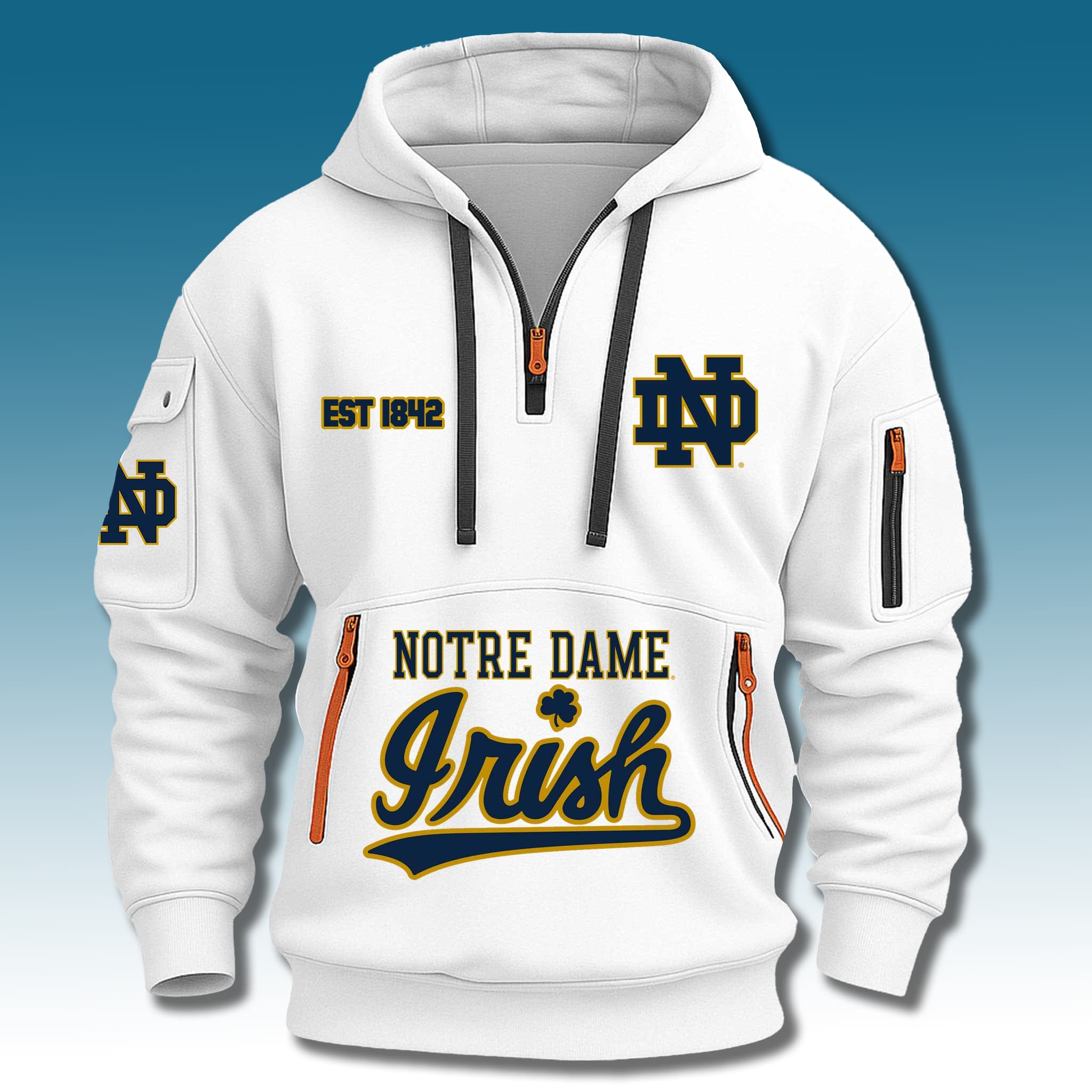 For the community of “The Fighting Irish” fans, the number 1842 is not only the founding year of the University of Notre Dame but also the beginning of a proud athletic heritage and an unyielding fighting spirit. The Notre Dame Fighting Irish EST 1842 Quarter Zip Hoodie was created to honor that long-standing legacy.