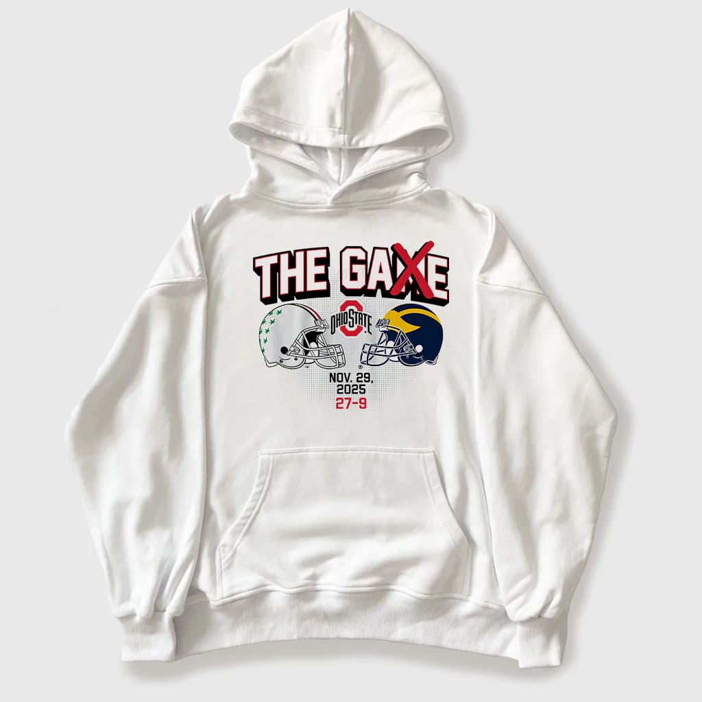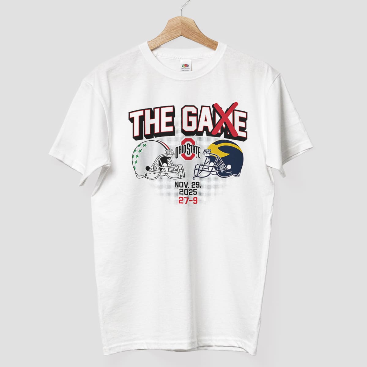 The Ohio State Beat Michigan 27-9 Shirt 2025 features a clean white base, bold red “THE GAME X” lettering with a powerful crossed-out X, two opposing helmets, and the highlighted score 27–9 in the center. The shirt carries a classic rivalry tee style – simple, yet enough to silence every Michigan fan.