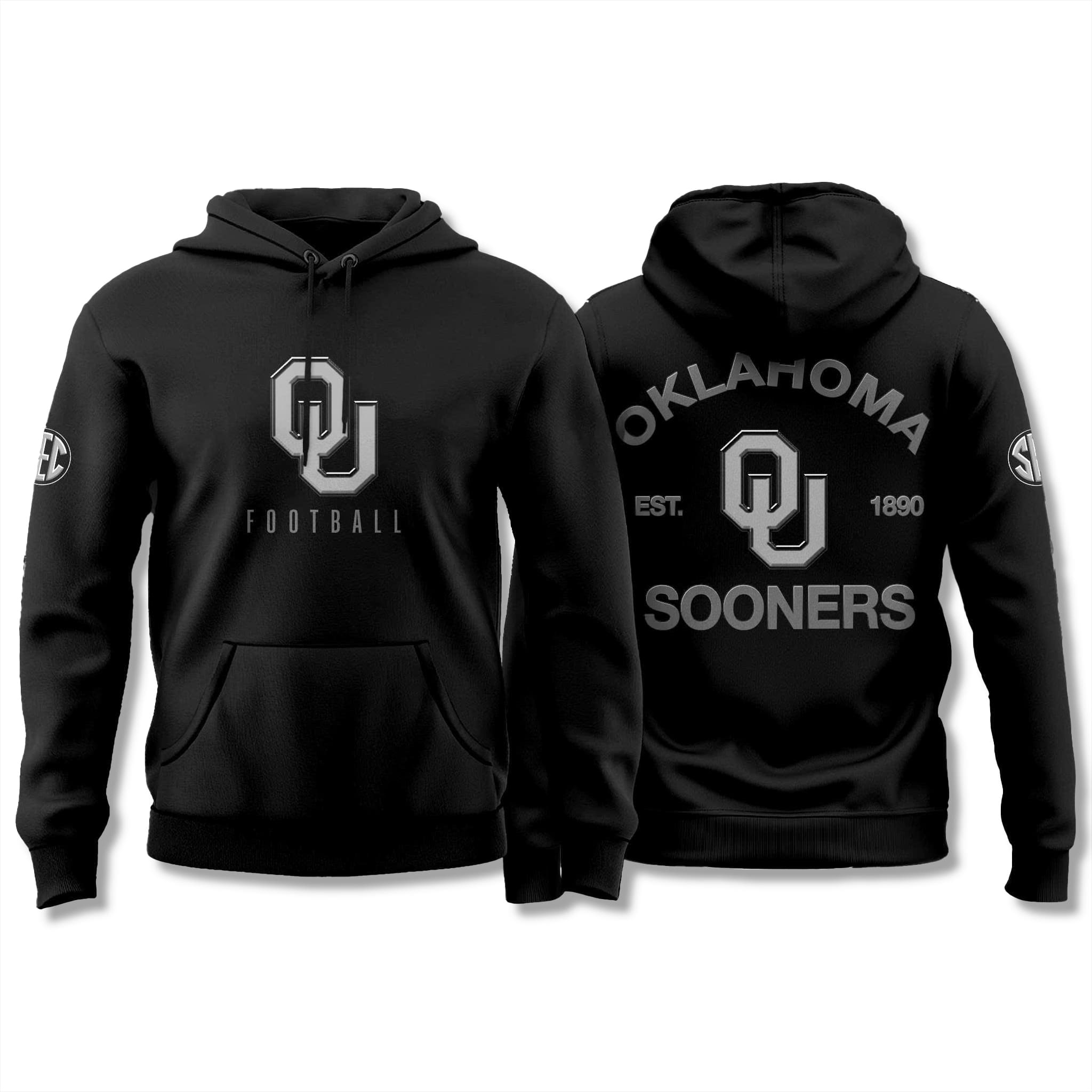 The hoodie features a deep, dominant black base that highlights the OU logo and “Sooners” lettering in a modern silver-gray palette. The design emphasizes bold typography and strong visual blocks, delivering a muscular, street-sport aesthetic that feels both contemporary and authentic.