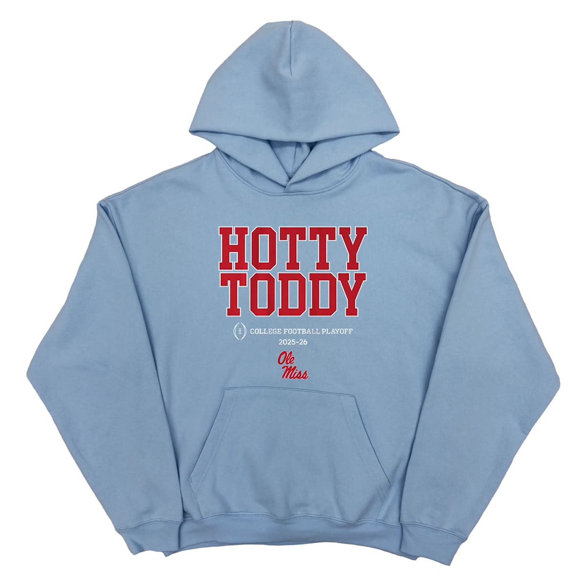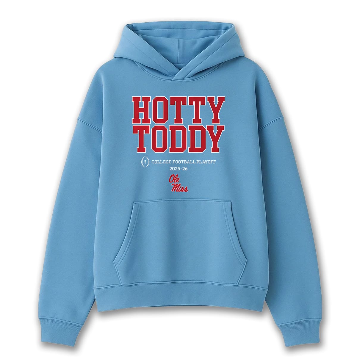 The Ole Miss Rebels 2025 CFP Shirt features a minimalist yet powerful design, with the signature Light Blue base color. The centerpiece is the bold red “HOTTY TODDY” lettering in a classic athletic font. The shirt embodies an energetic style that fully conveys the pride of fans as their team heads into the CFP.