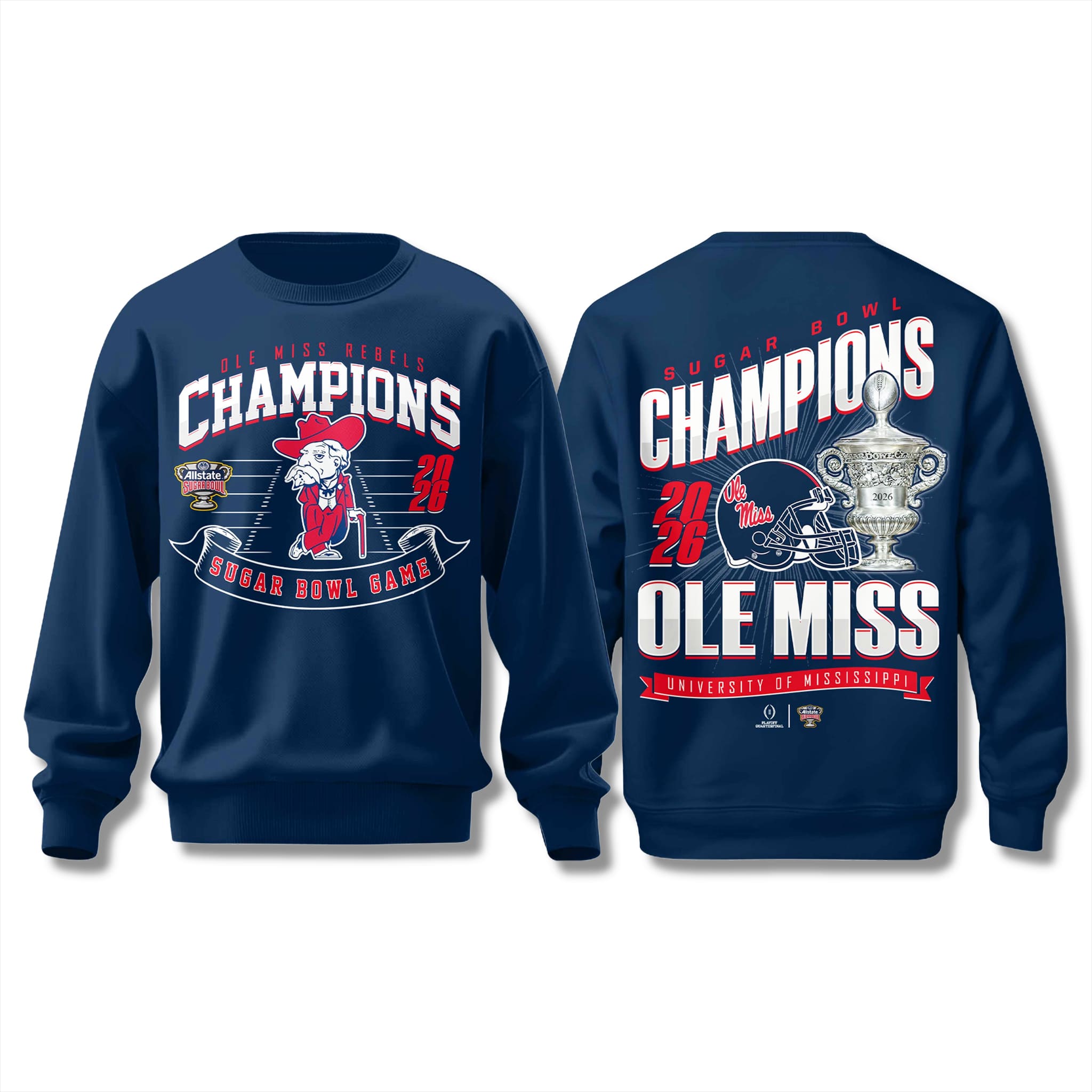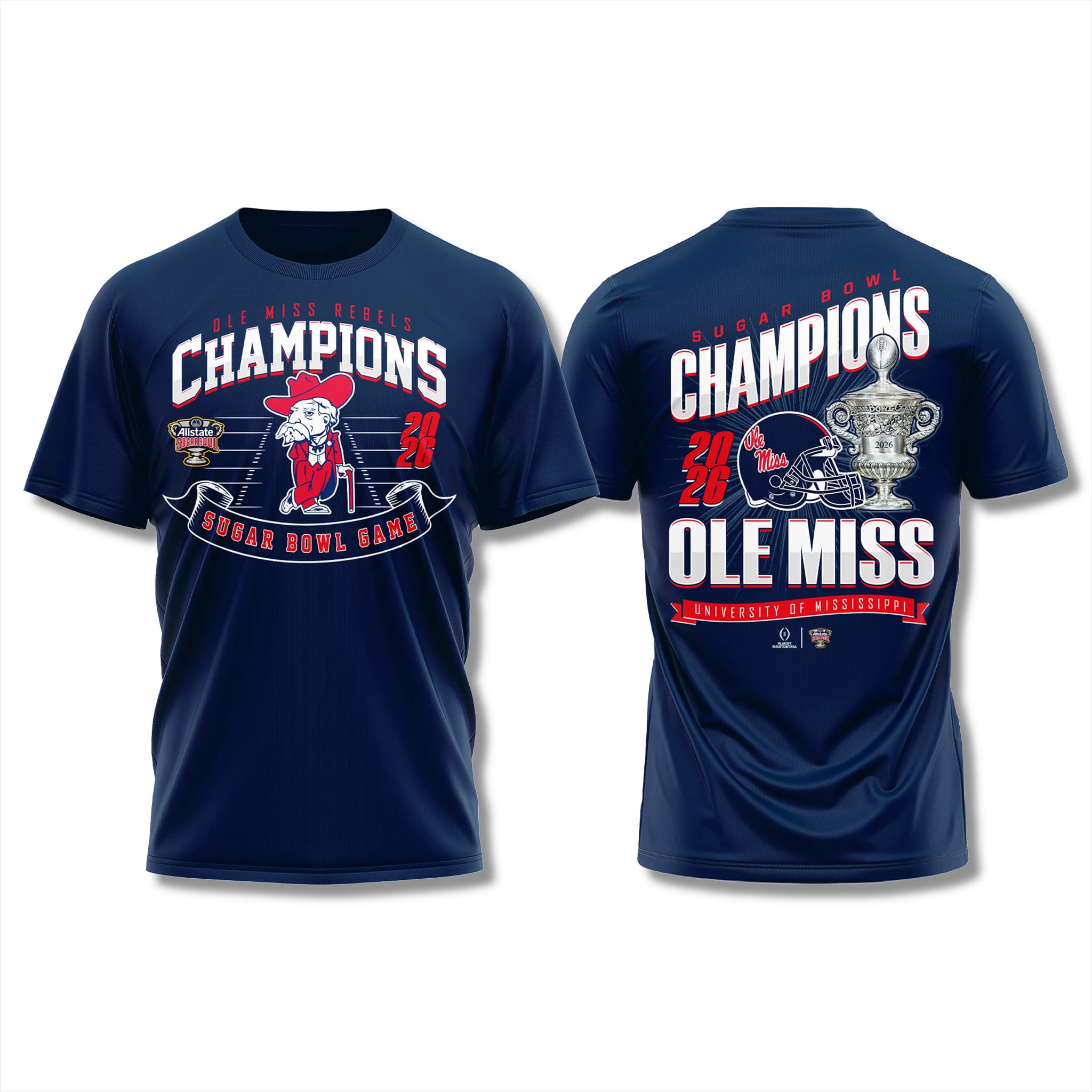 The Ole Miss Rebels 2026 Sugar Bowl Champions Shirt is an official commemorative tee for Ole Miss Rebels fans, capturing the emotional 39–34 victory over the Georgia Bulldogs in the 2026 College Football Playoff quarterfinal. With a clutch, last-second field goal by Lucas Carneiro, the Rebels completed a stunning comeback, avenged their regular-season loss, and advanced to the CFP semifinals for the first time under head coach Pete Golding – igniting pure joy across the entire Hotty Toddy community.