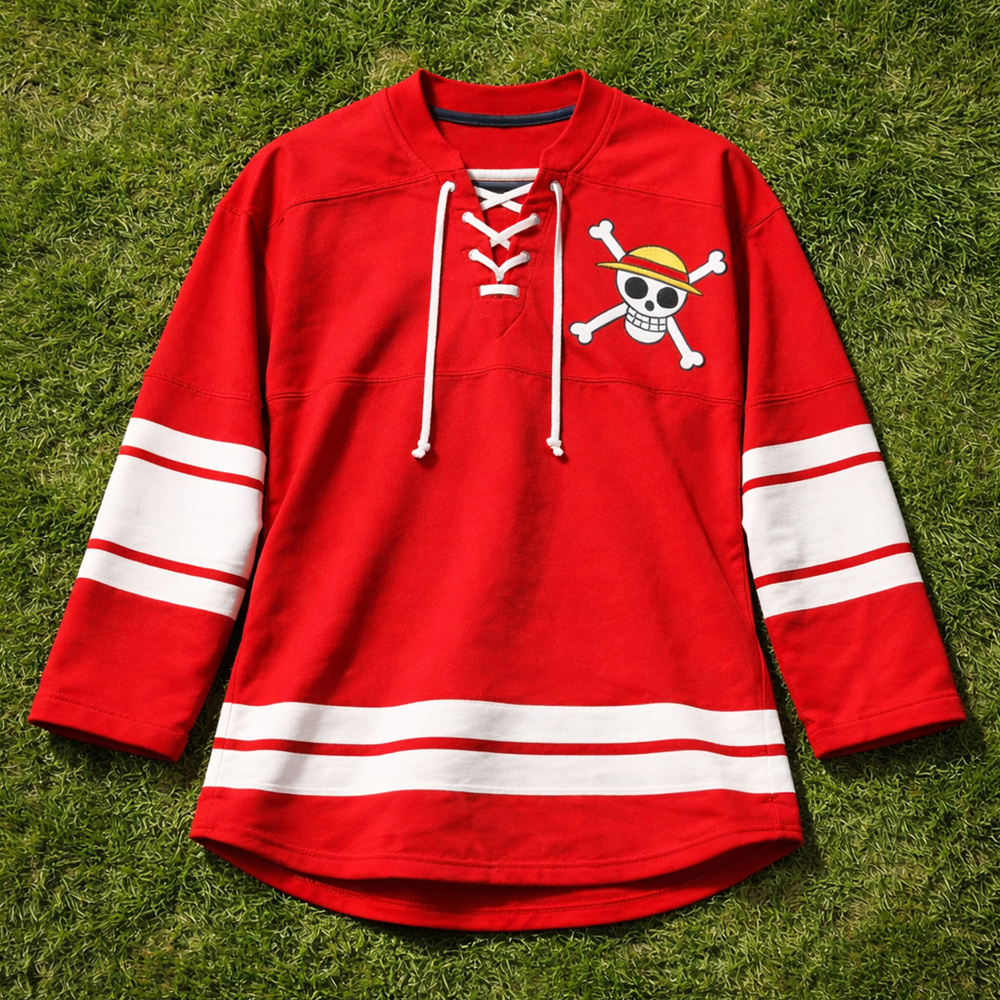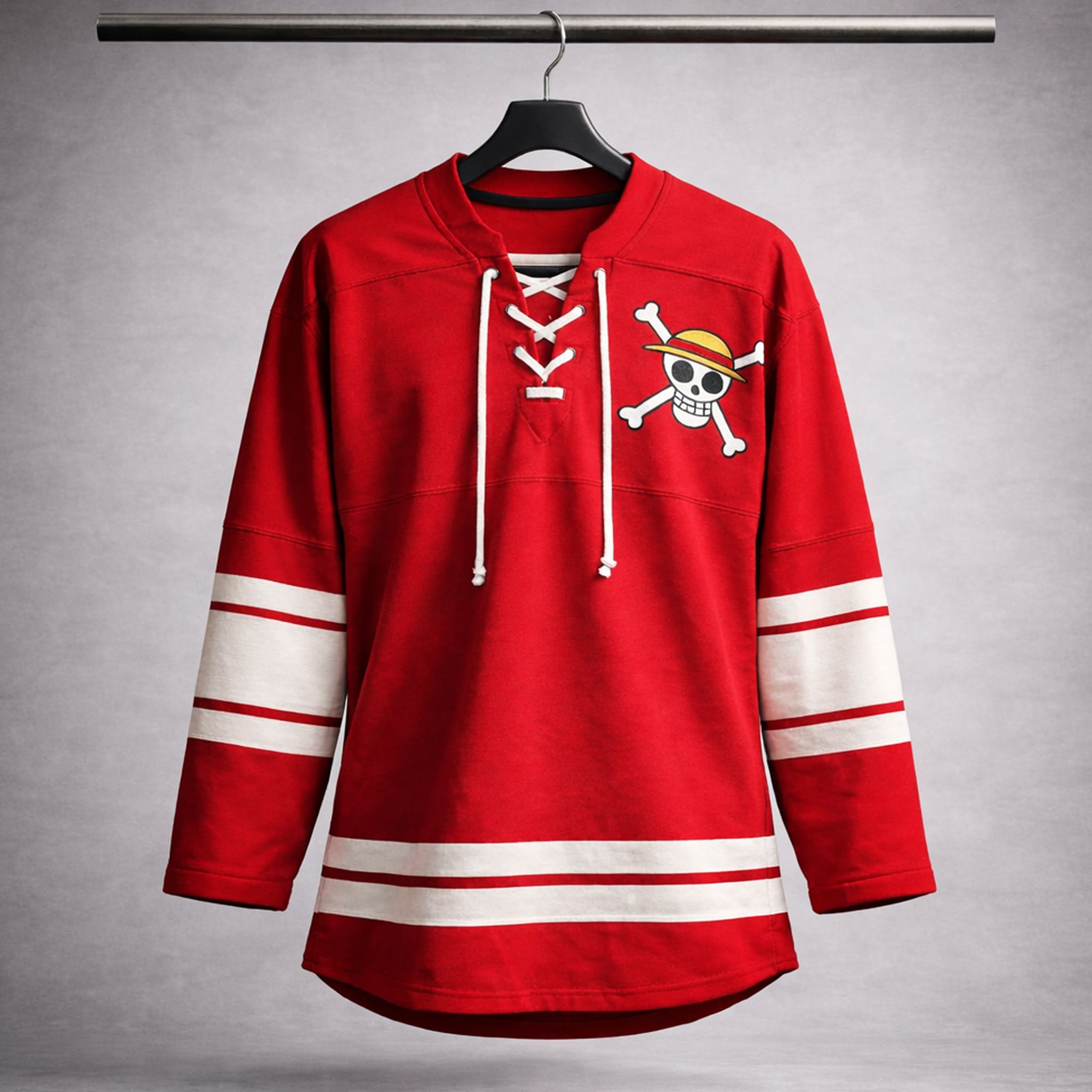 2026 One Piece Red Hockey Jersey – Jolly Roger Straw Hat Pirates on Ice