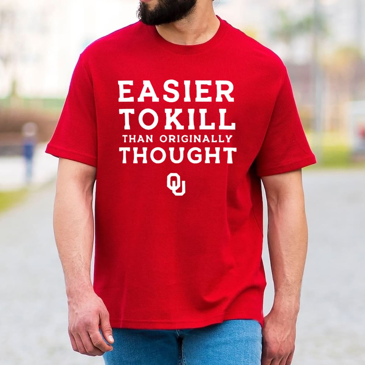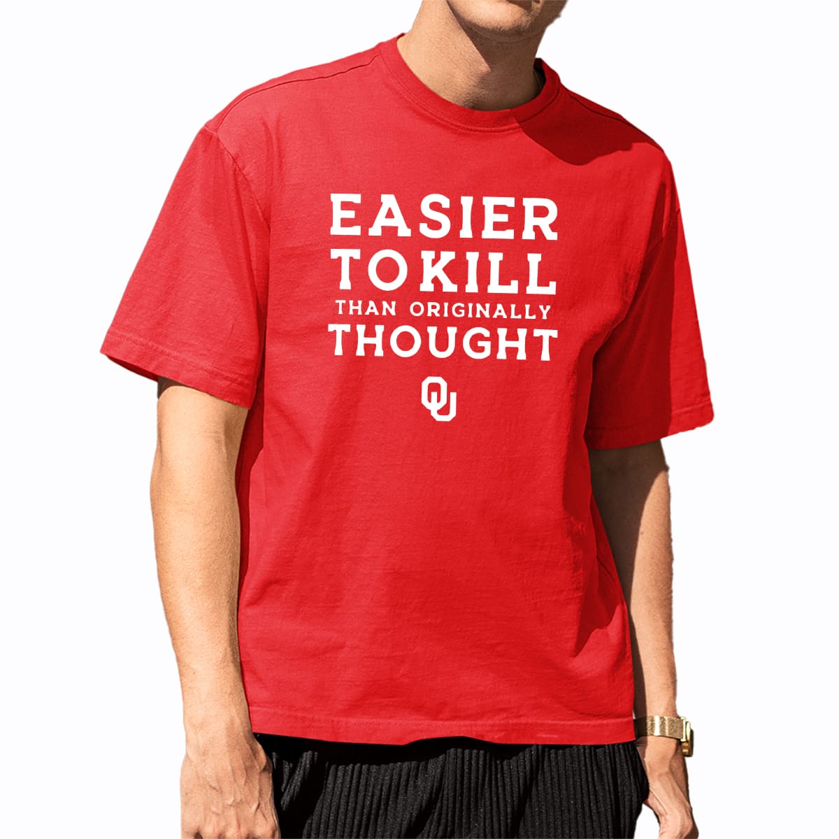 This shirt flips that message into “Easier To Kill Than Originally Thought,” aimed at rival fans who want to poke fun at the Sooners – especially following their recent playoff loss – using the dark humor that defines college football rivalries.