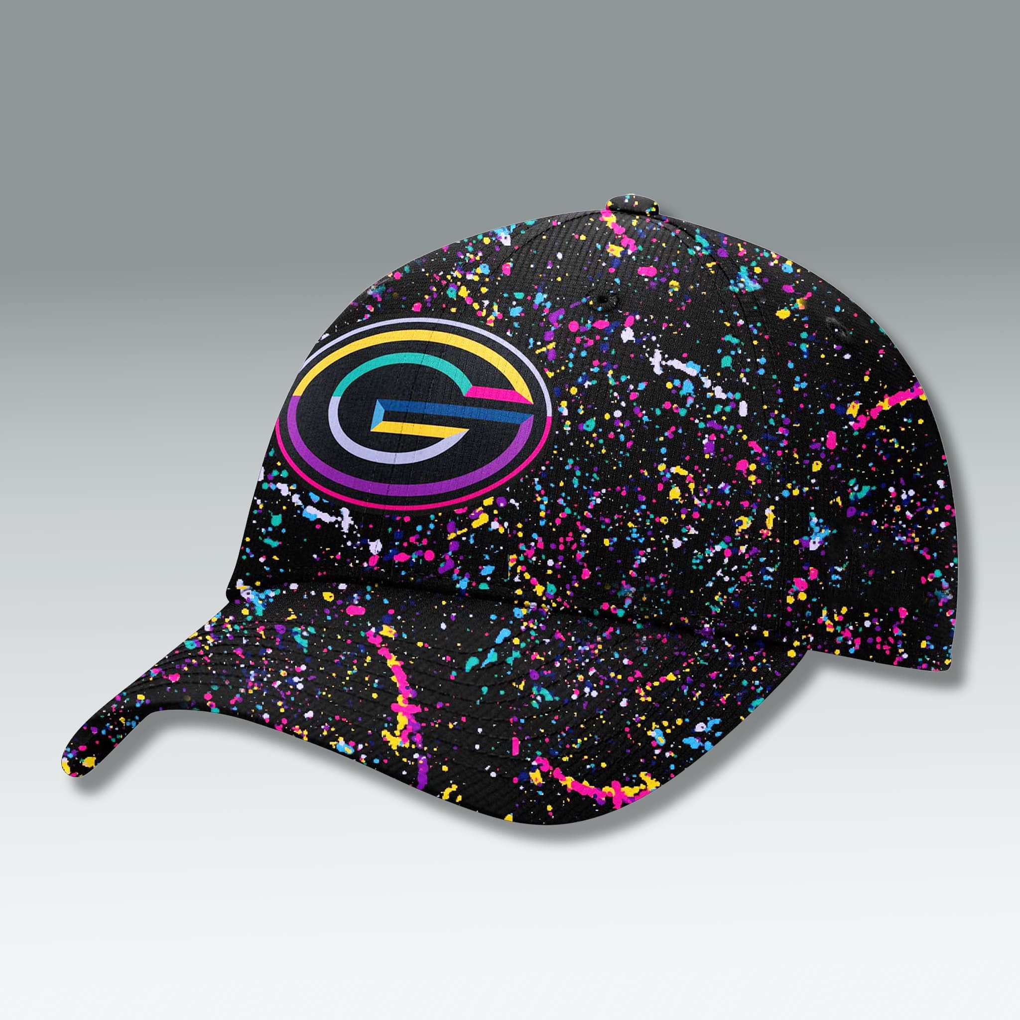 The design of the Packers Intercept Cancer Hat is intentionally bold and symbolic. These bright, energetic bursts of pink, blue, yellow, and green represent the diverse forms of cancer we are fighting against. The iconic Packers ‘G’ logo takes center stage, outlined in striking neon colors, transforming a classic emblem into a beacon of awareness.