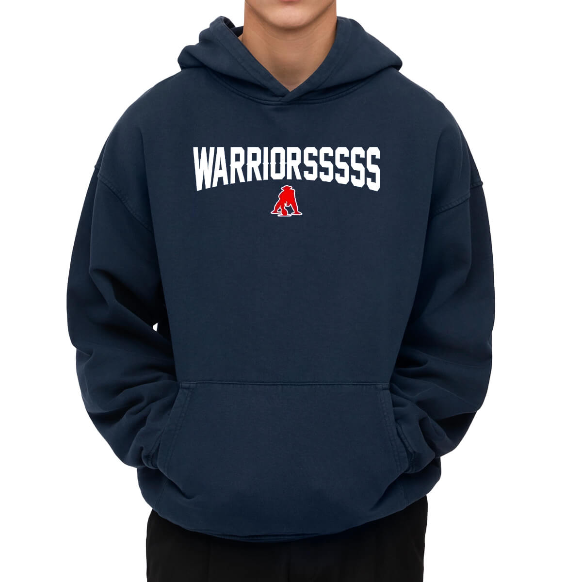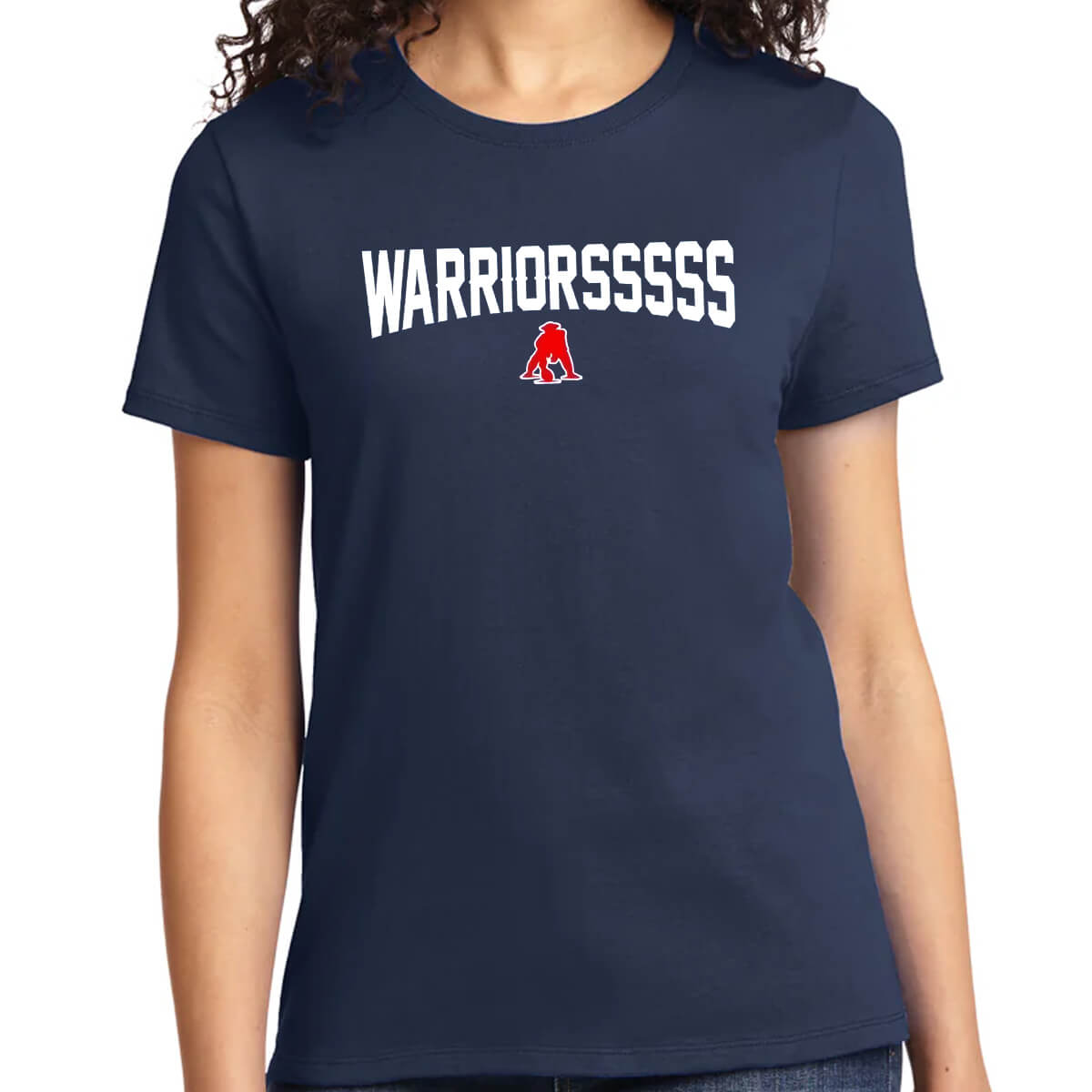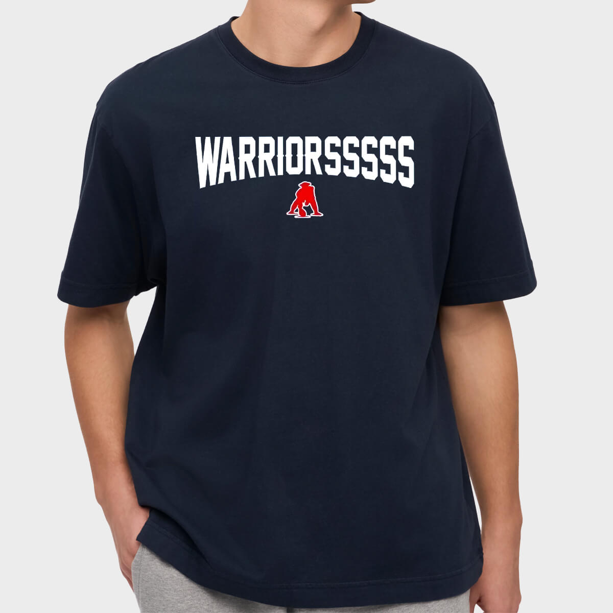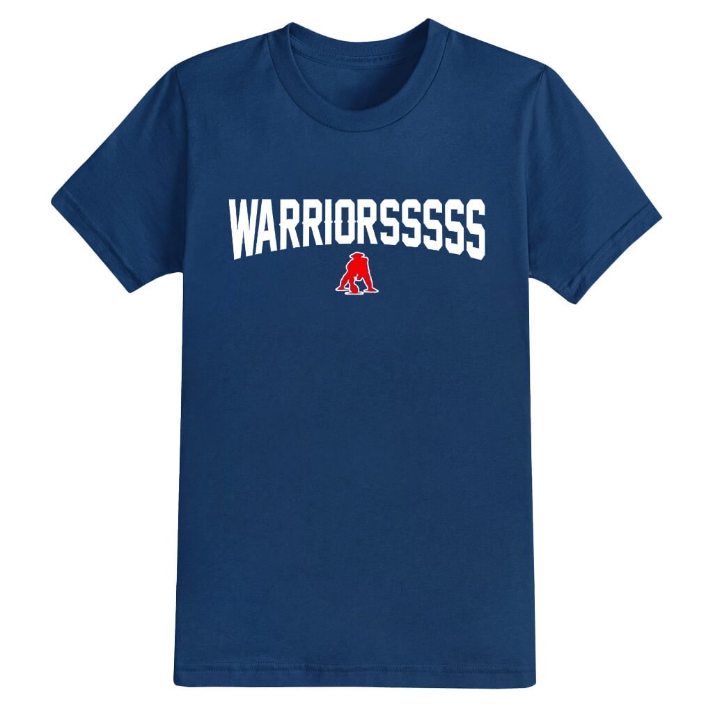 This shirt features a bold navy tone, with the curved white “WARRIORSSSSSSSS” text prominently printed on the front, paired with a fiery red Pat Patriot warrior emblem beneath the lettering. This creates a rugged retro sports style that’s easy to pair casually or wear while cheering during games.