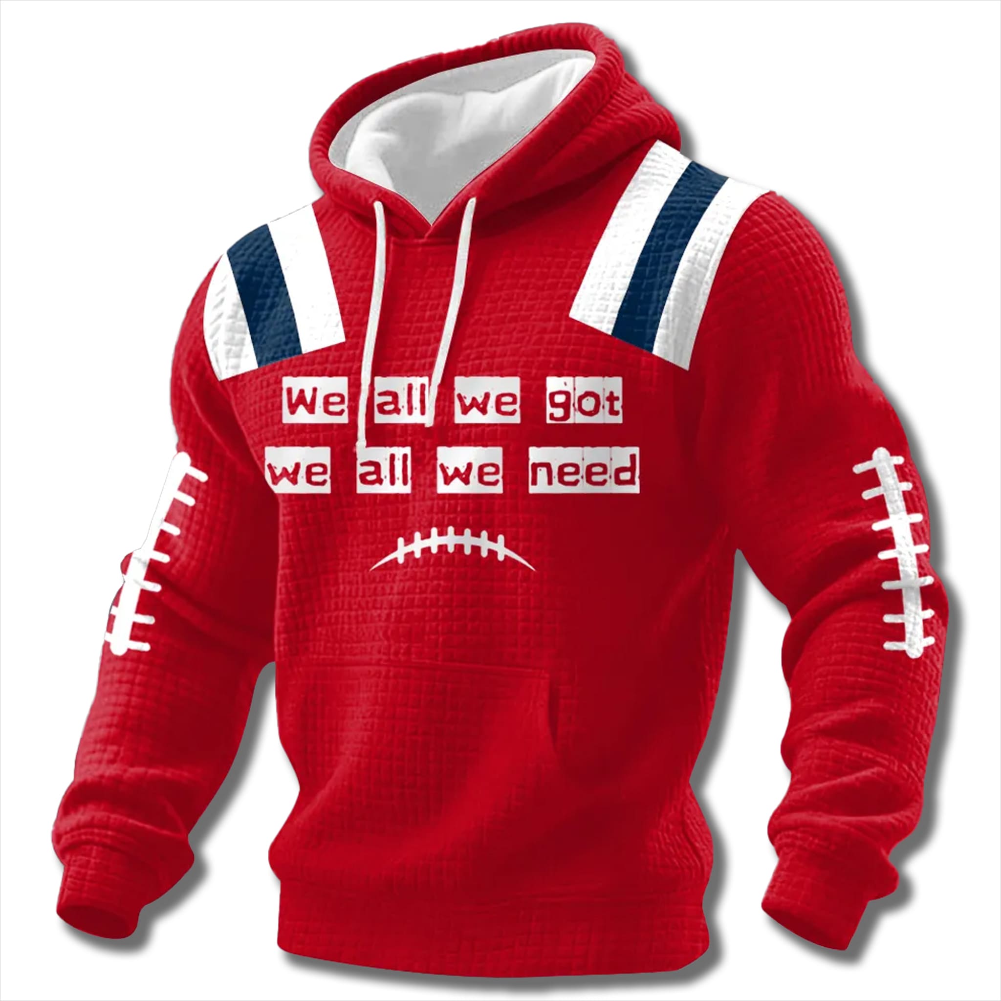 This hoodie features a thick waffle texture and is available at iFrogtees in three cozy color options: red, blue, and clean white. The bold “We all we got – We all we need” slogan stands out on the front, paired with football graphics and red-navy shoulder accents inspired by Gillette Stadium. The result is a modern, casual sports style that feels comfortable, energetic, and warm.
