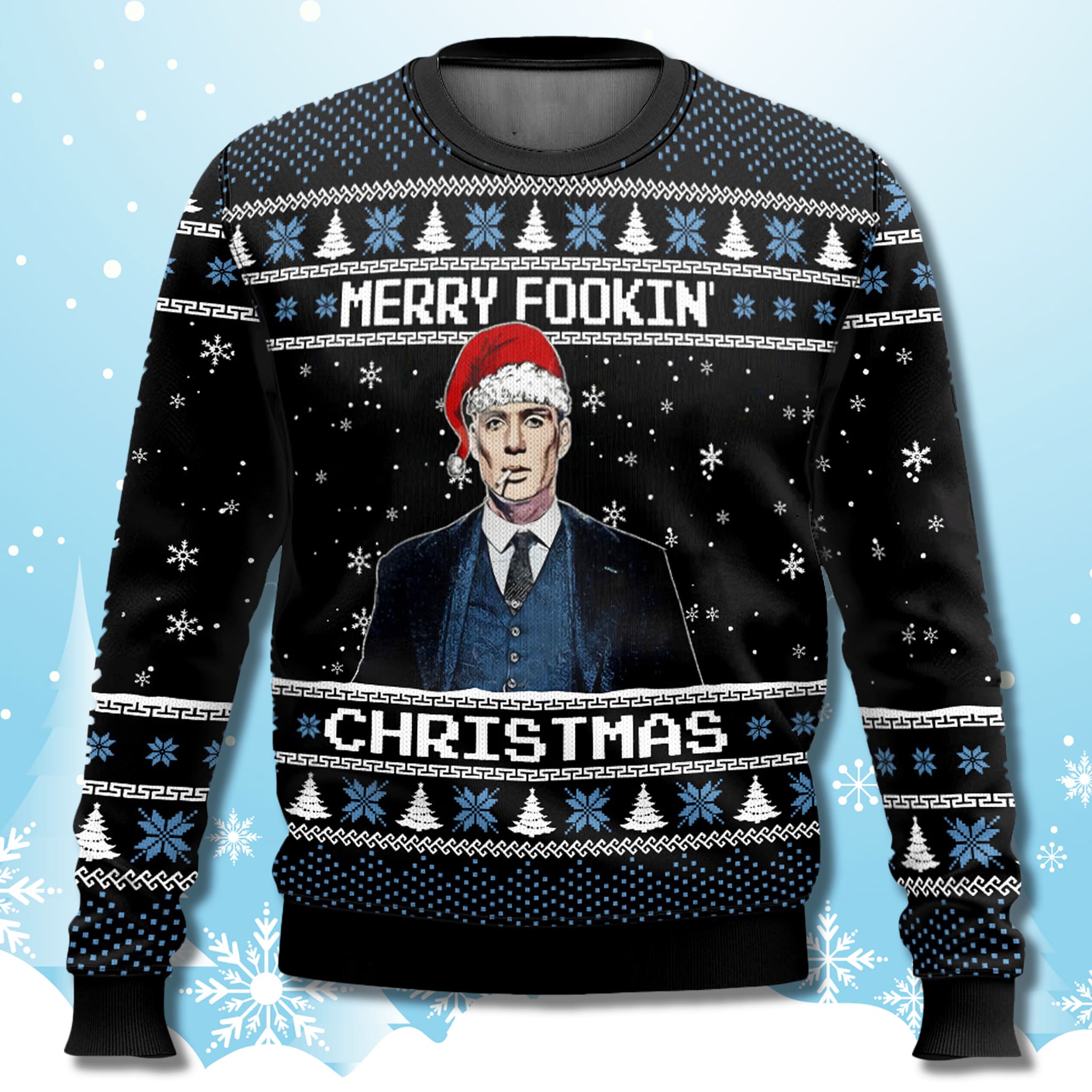 The Peaky Blinders Merry Fookin’ Christmas Sweater is the perfect way to bring Tommy Shelby into your holiday season – where “Merry fookin’ Christmas” replaces the usual greeting, and Tommy wears a Santa hat but keeps that stare ready for “By order of the Peaky Blinders.” Order now so the world knows you belong to the Shelby gang!