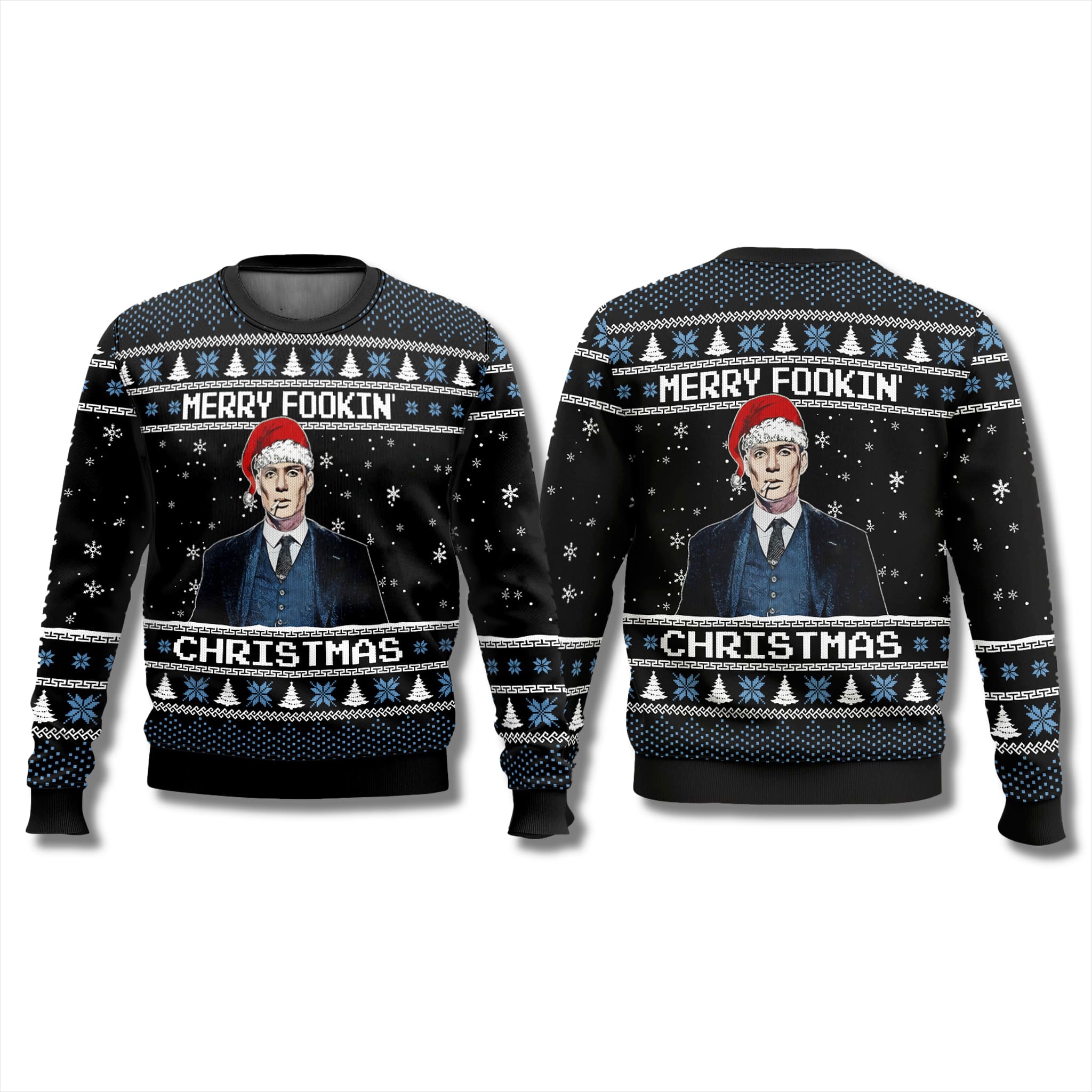 The Peaky Blinders Merry Fookin’ Christmas Sweater is the most sought-after holiday item among Peaky Blinders fans for Christmas 2025, directly inspired by Tommy Shelby’s (Cillian Murphy) iconic line in the series – turning a traditional Christmas greeting into a bold, dark-humored Birmingham version. Featuring Tommy wearing a red Santa hat, cigarette still clenched between his lips, and his signature cold stare, this sweater transforms the ugly sweater look into a festive “By order of the Peaky Blinders” moment, bringing a hint of Shelby gunpowder to every holiday party.