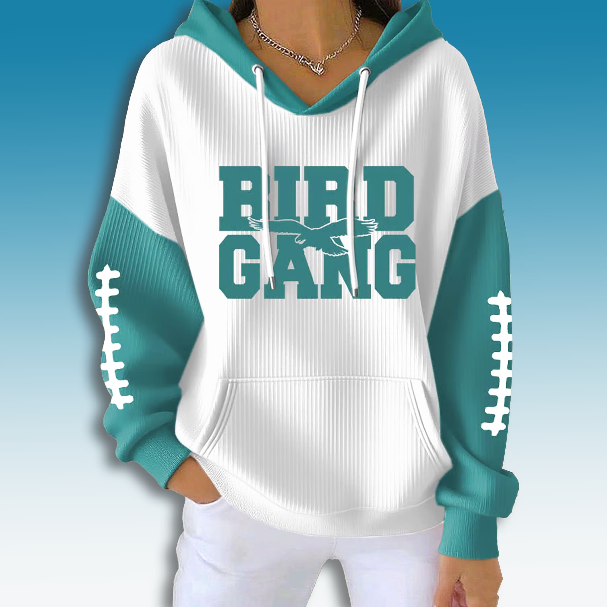 The Eagles Bird Gang Hoodie‘s vibrant design pulses with “Bird Gang” lettering intertwined with soaring eagle silhouettes in midnight green on a pristine white waffle-knit body, framed by color-blocked sleeves and football-stitched piping for a layered, athletic silhouette that screams coordinated chaos and aerial dominance.
