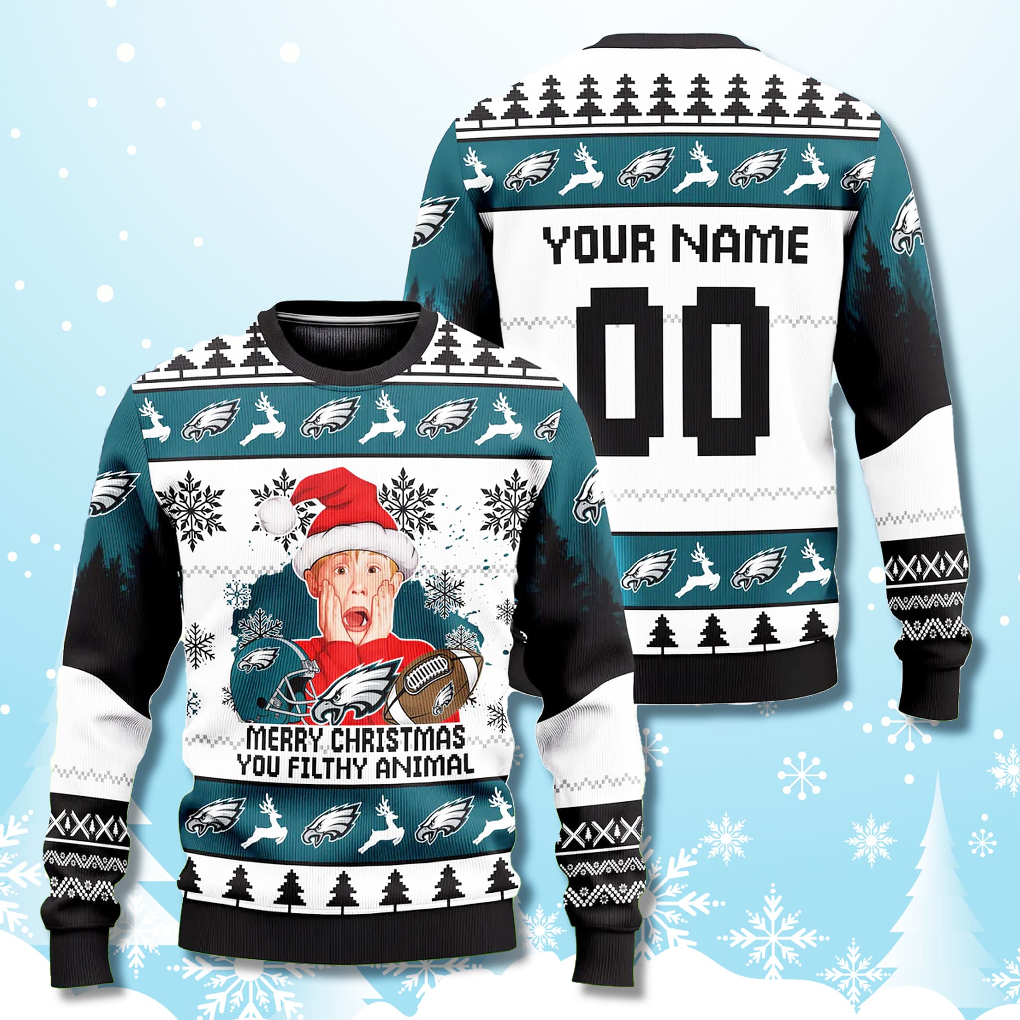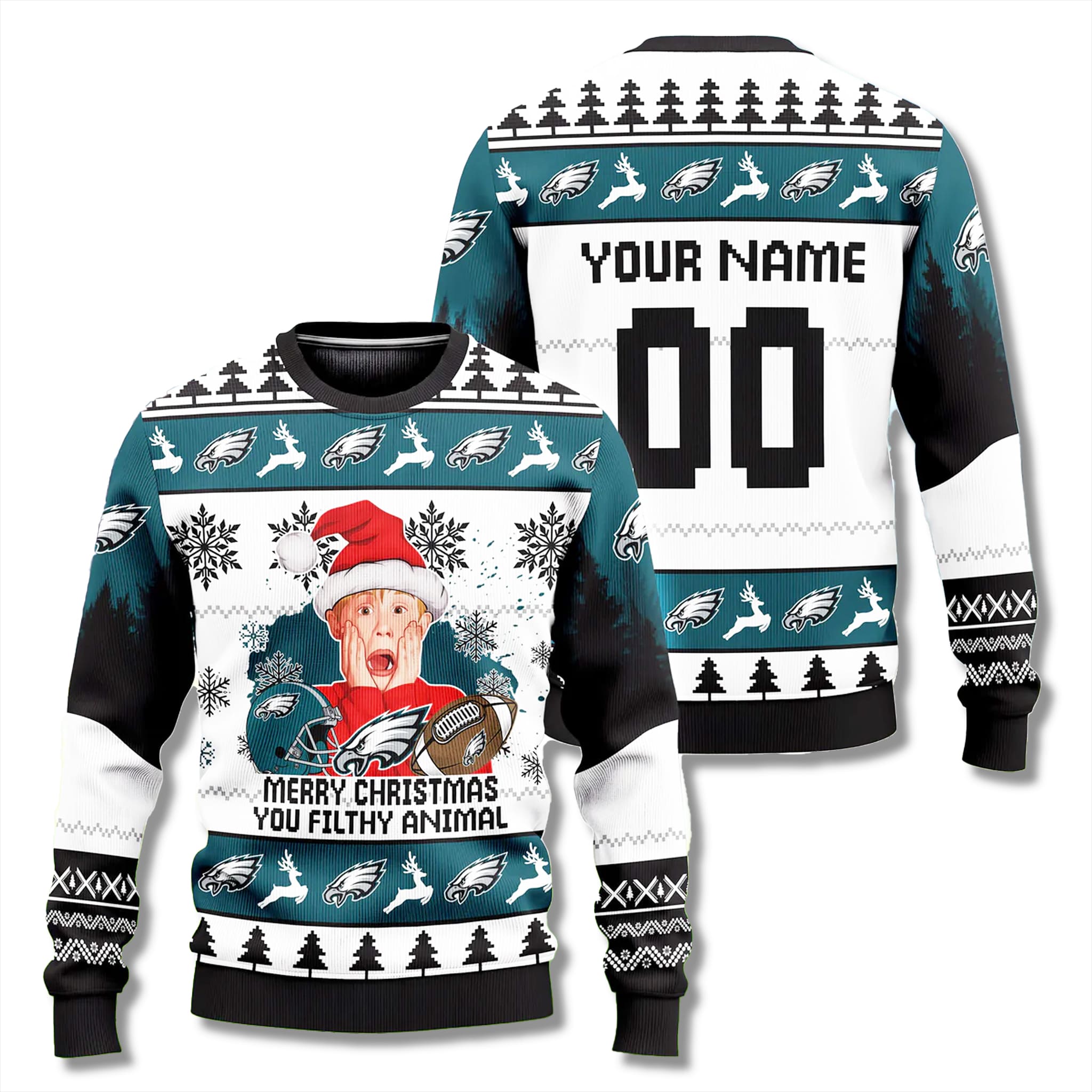 The Eagles Home Alone Ugly Sweater Christmas 2025 is not only a warm item, but also a statement of personality for die-hard fans of The Birds. Inspired by the classic Kevin McCallister scene, this sweater is sure to make you the center of attention at any Ugly Sweater party this year with the immortal line: “Merry Christmas You Filthy Animal”.