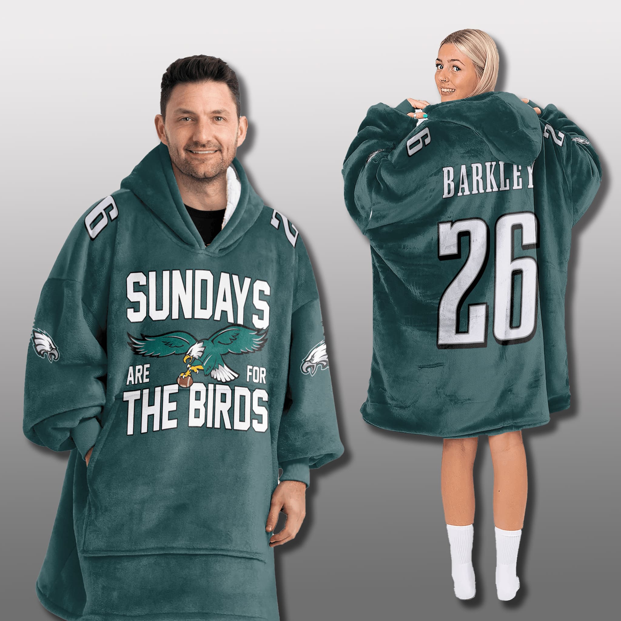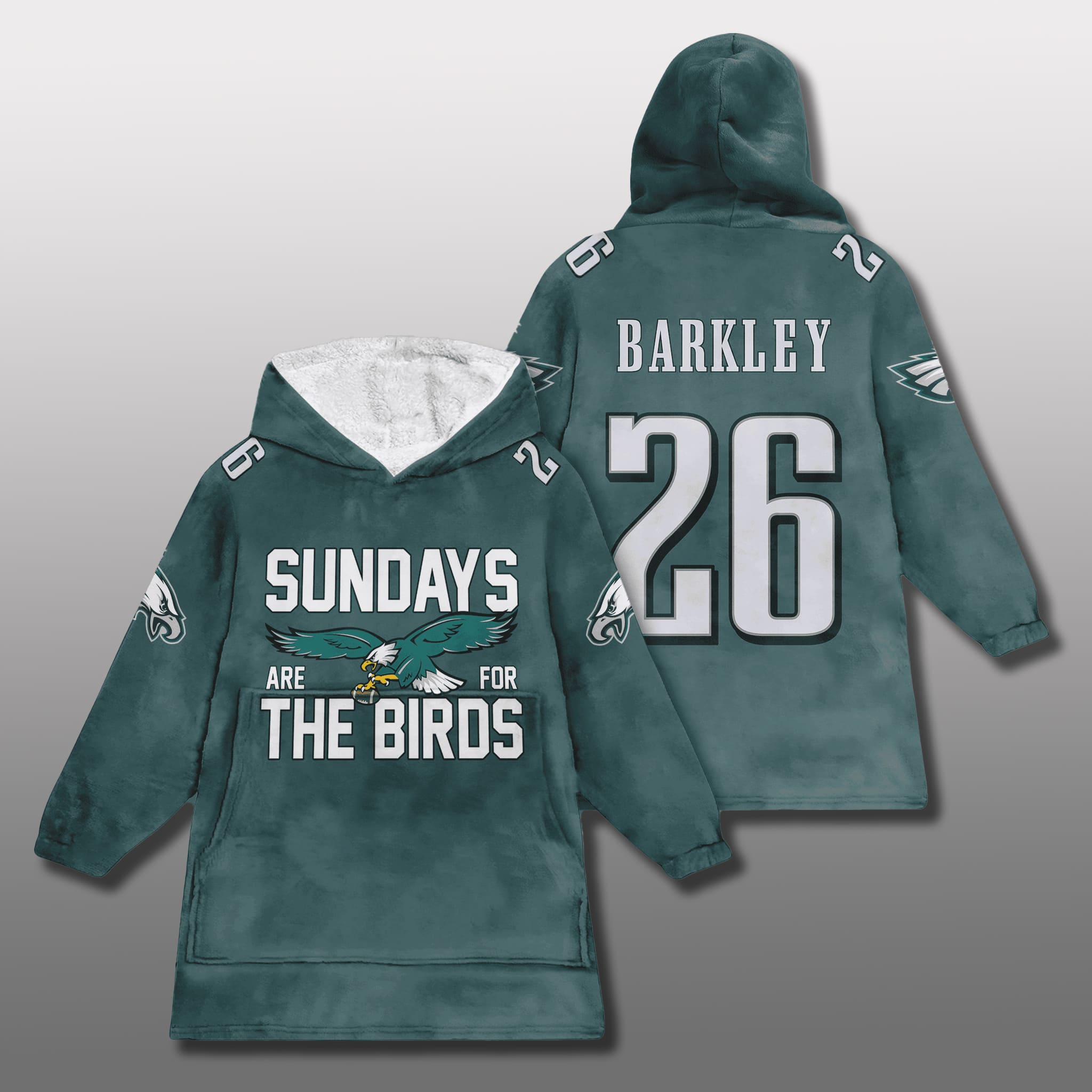 The design of this Sundays Are For The Birds Eagles Blanket Hoodie features a comfortable oversized fit, in the team’s signature green color, accented with eagle graphics and Barkley’s number 26. The smooth outer layer and soft, windproof fleece lining create an ideal casual sports style for game day viewing.