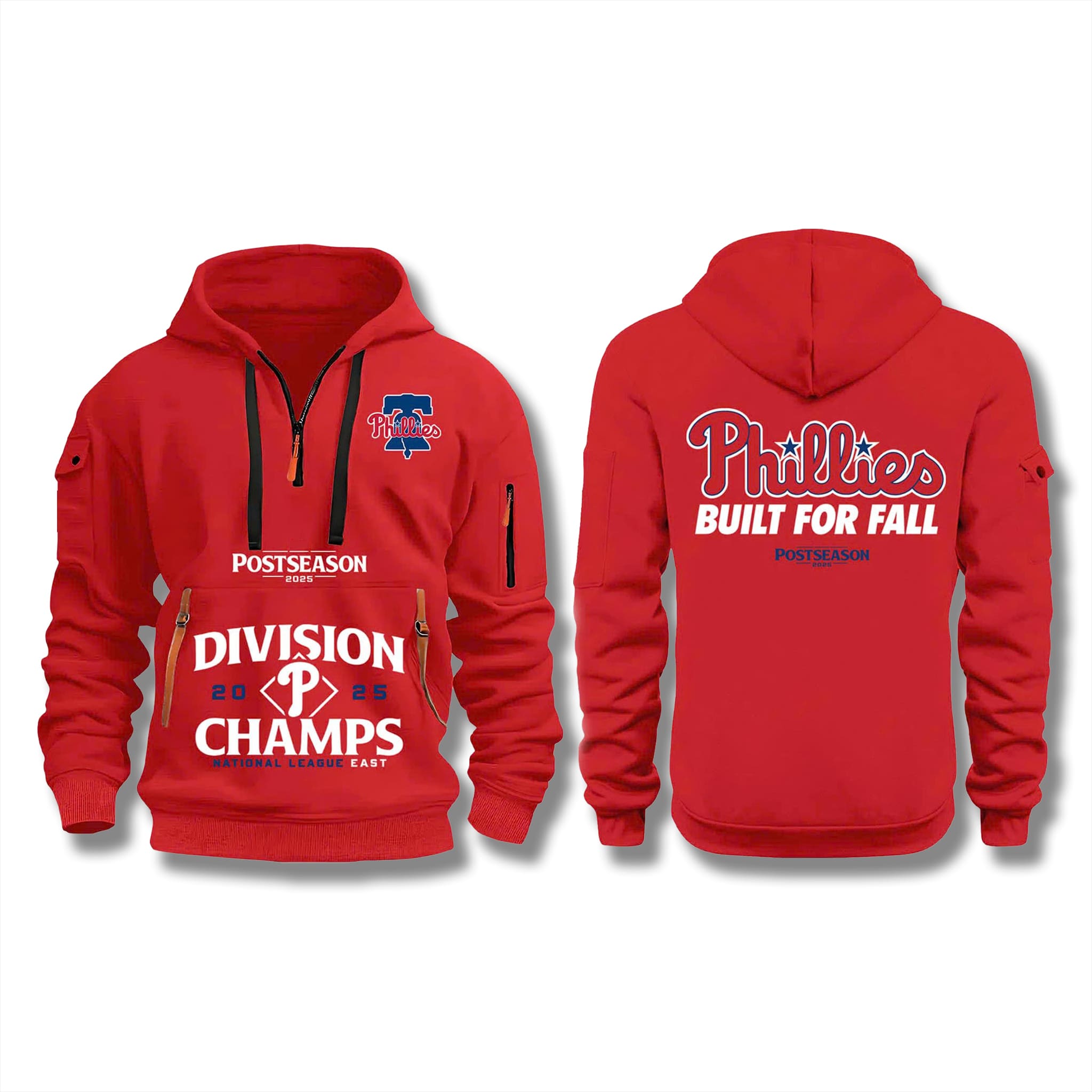 The front panel arcs with the “Division Champs 2025” crest and NL East seal, while the back boldly proclaims “Built For Fall Postseason,” infusing every zip with the Phillies‘ defiant push toward ring-worthy runs.