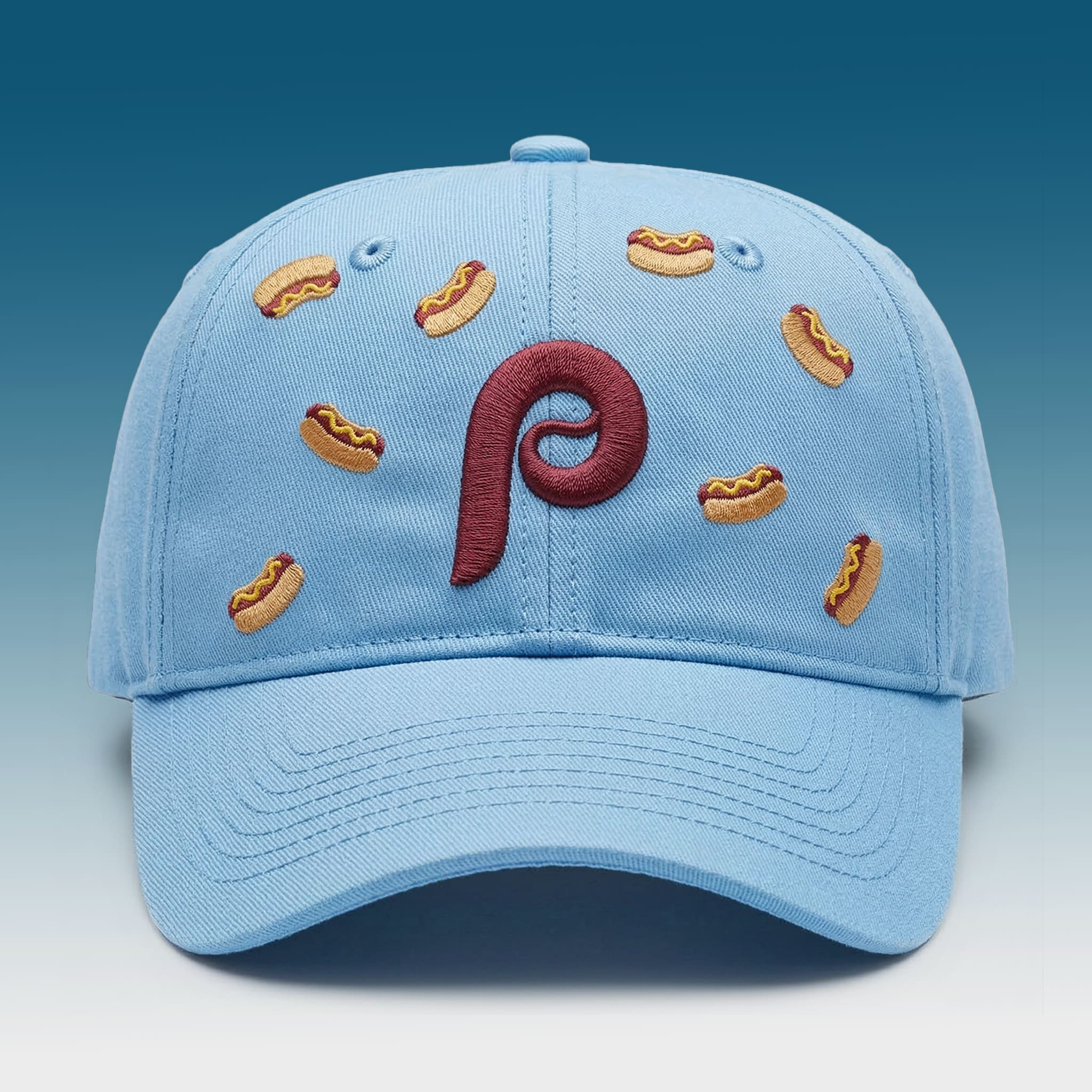 This hat design is a combination of the Philadelphia Phillies’ heritage and a fun, humorous hot dog theme. It stands out with a fresh powder blue tone, playful patterns, and the Phillies logo – A symbol of joy, ballpark tradition, and Philadelphia Phillies pride.