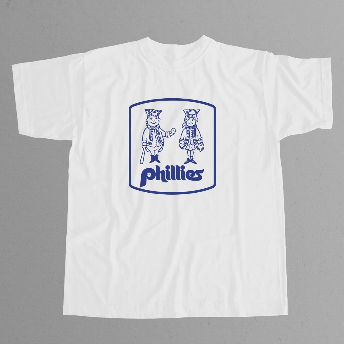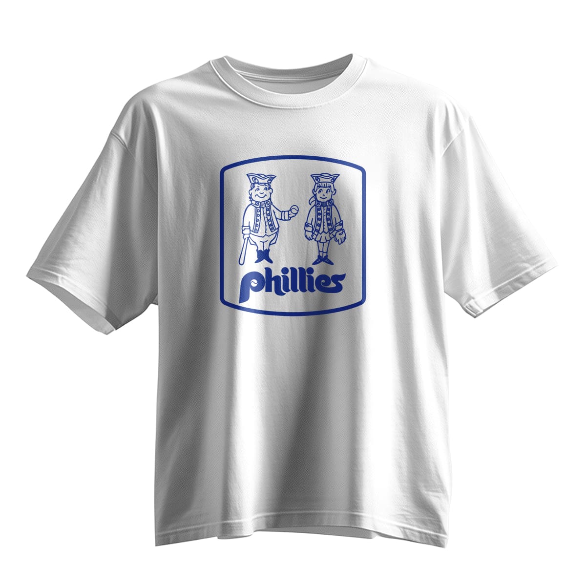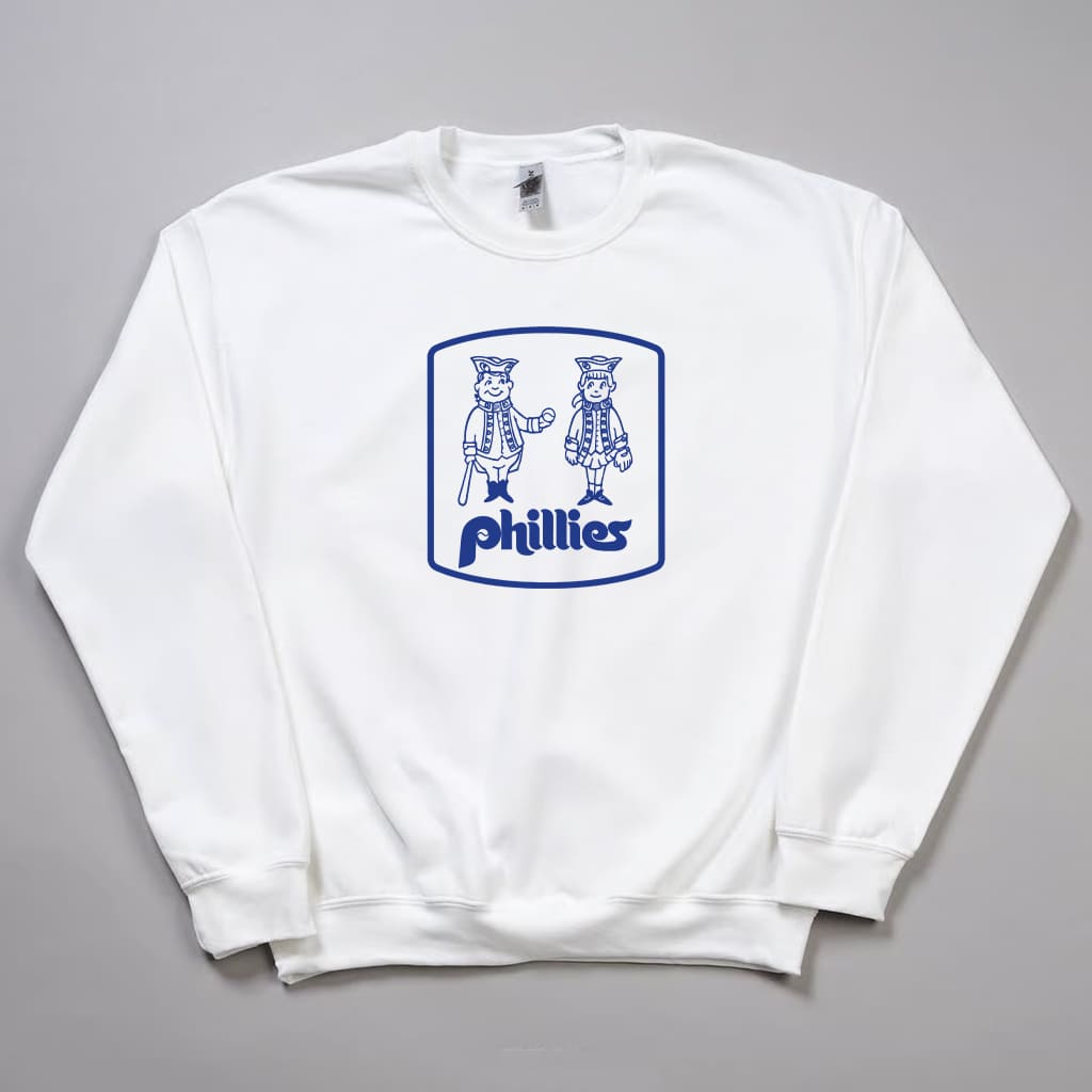This shirt features a clean white design that is simple yet meaningful: at the center is an image of Phil and Phillis in colonial-era attire, holding baseball bats, framed within a navy square border alongside the original Phillies logo, creating a warm retro vibe. If you cannot attend at Citizens Bank Park, you can still own this commemorative edition by purchasing it directly at iFrogtees with full color and size options available.