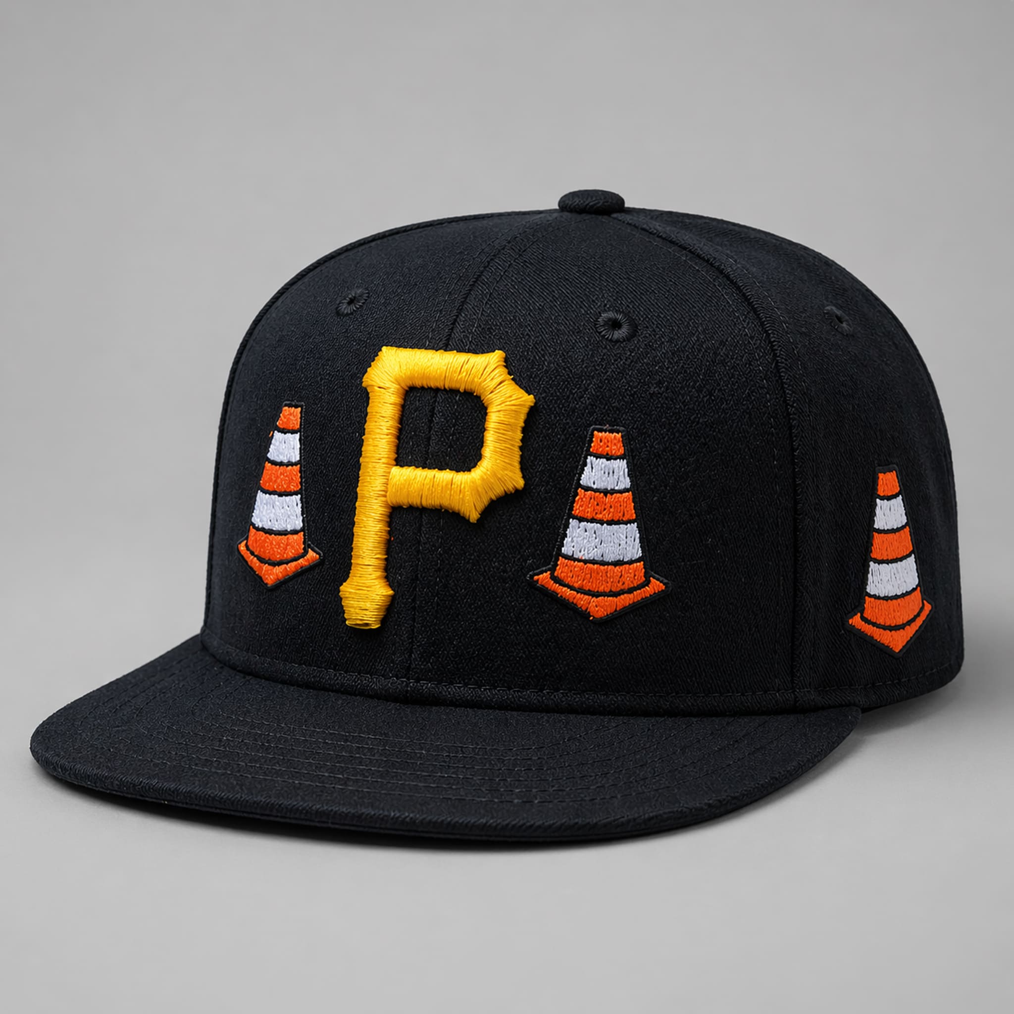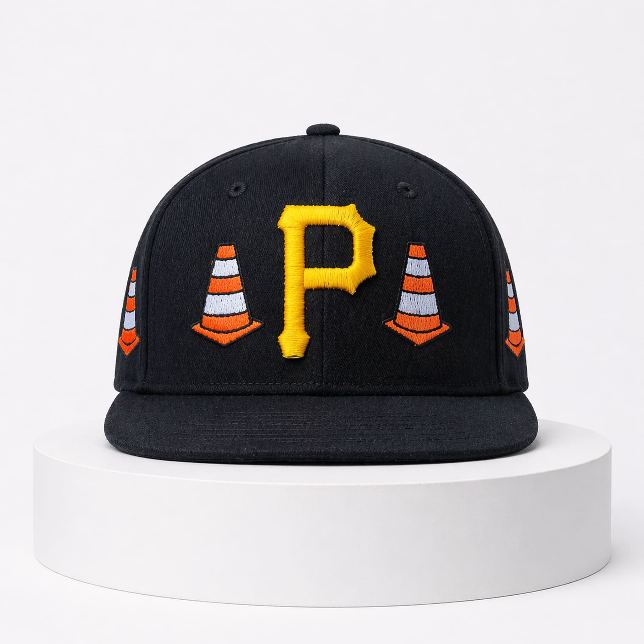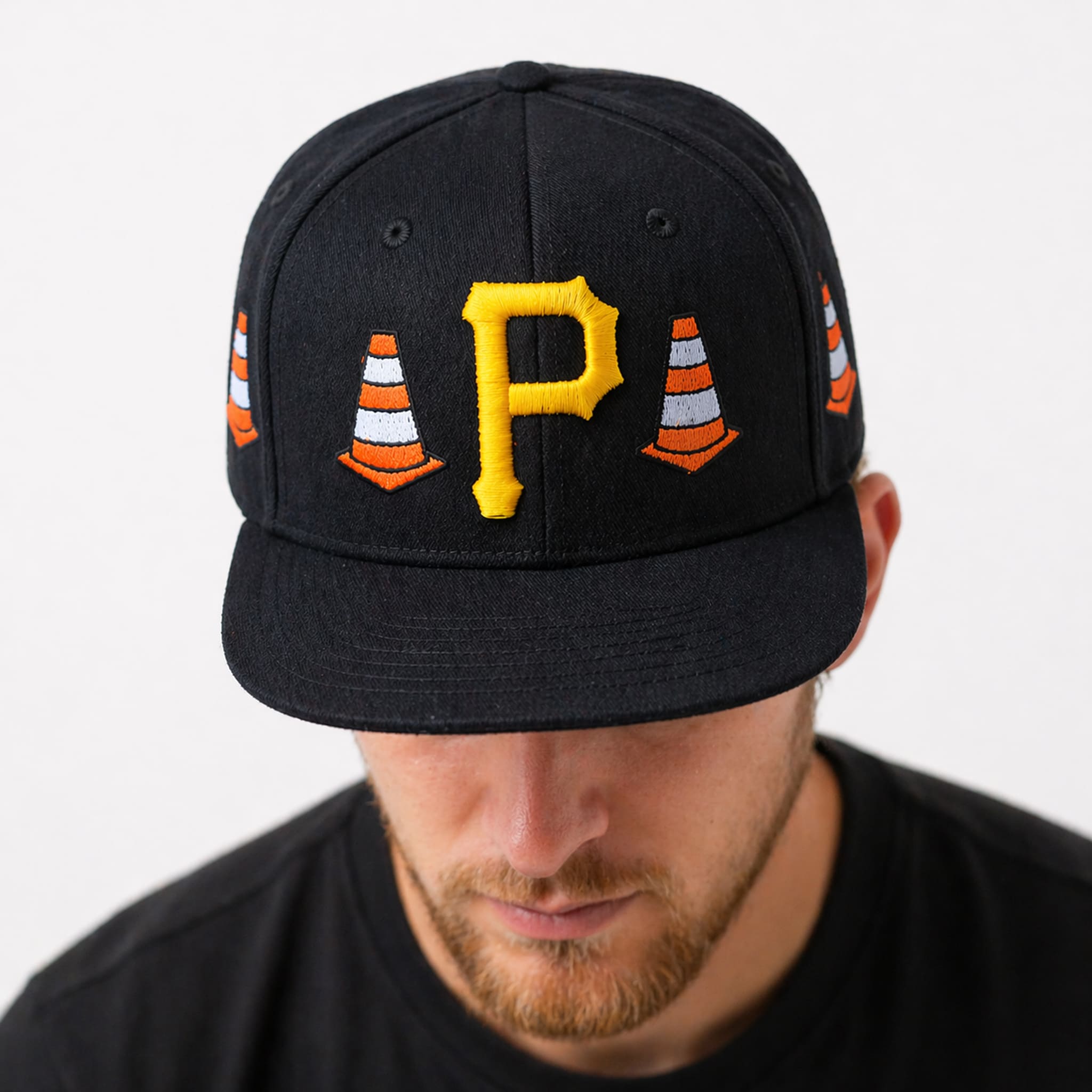 The Pirates Raise The Cone Hat is a bold black snapback inspired directly by the “Hoist The Cone” slogan – a viral phenomenon taking over PNC Park and the Pittsburgh Pirates community in the 2026 season.