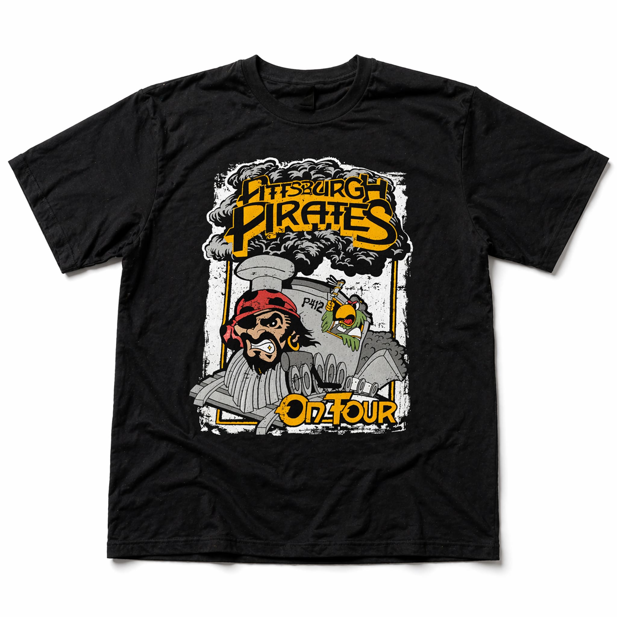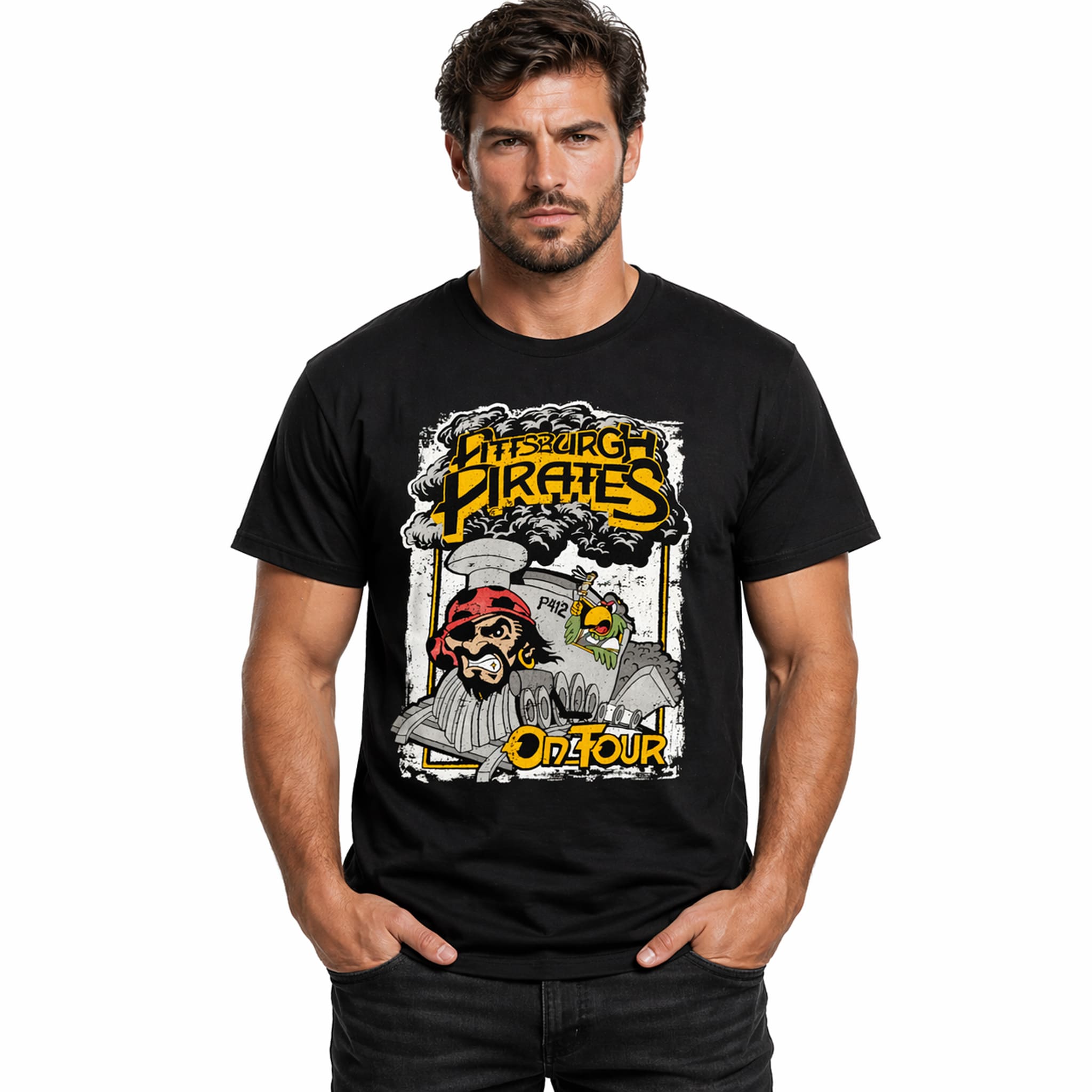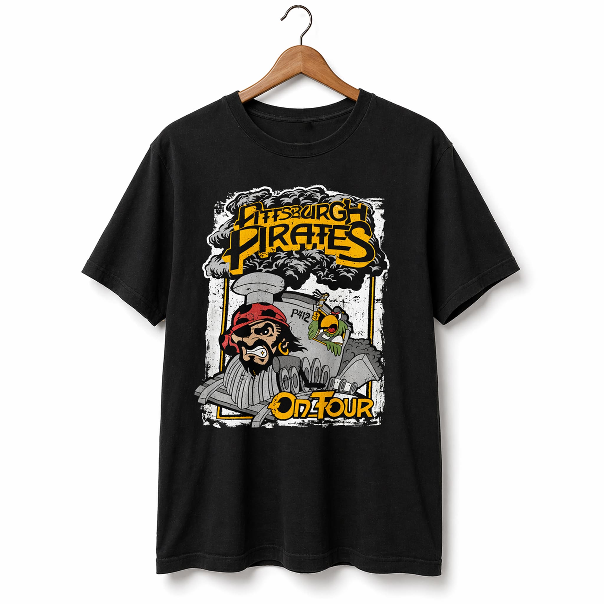 This design stands out with bold graphics inspired by classic rock band merchandise: Set against a sleek black background, it features a powerful pirate “captain” commanding locomotive No. “P412” as it charges through clouds of gray smoke. A signature highlight is the loyal parrot mascot, along with the phrase “Pittsburgh Pirates – ON TOUR” styled in a striking heavy metal font, creating a look that is both rugged and proud.