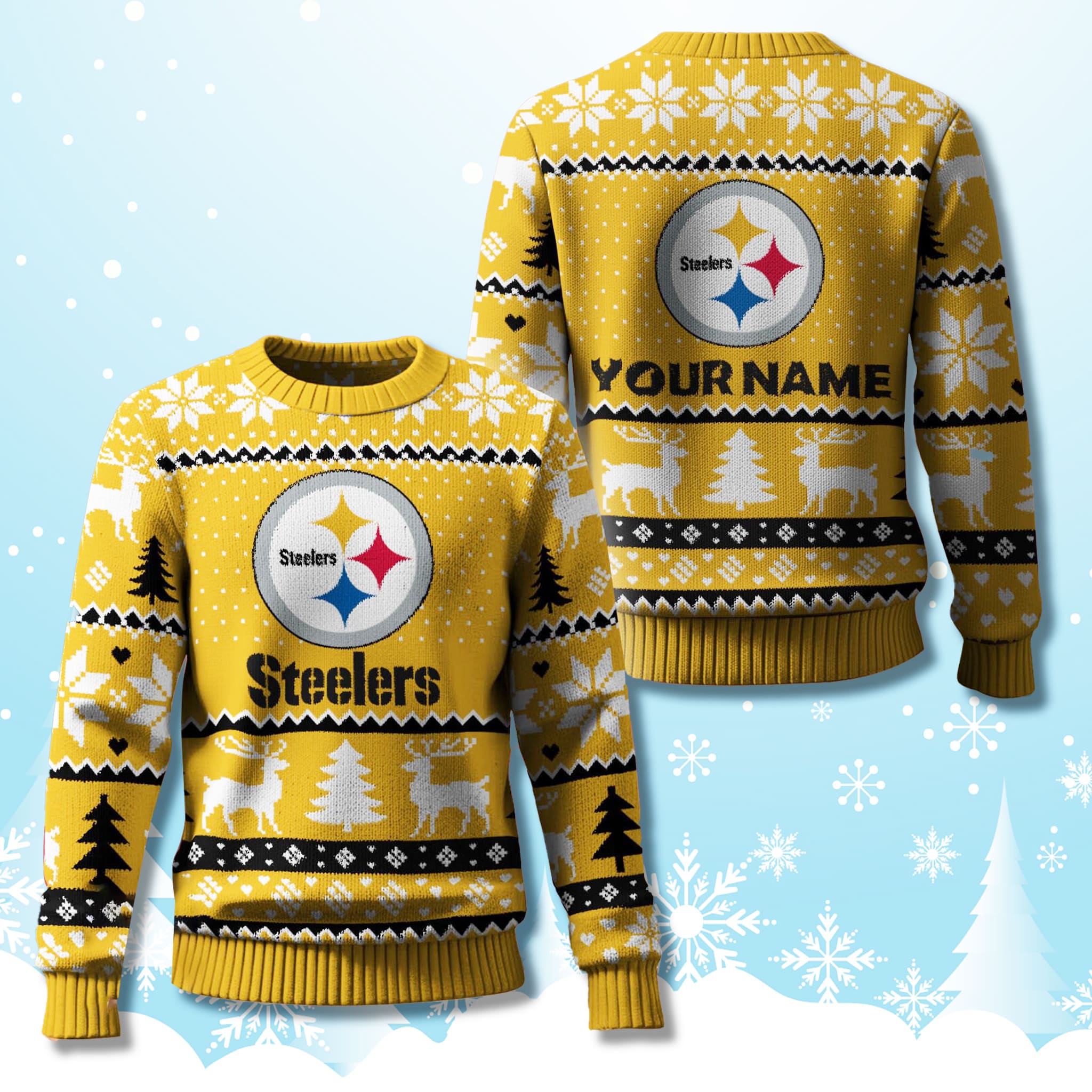 This Steelers ugly sweater features the team’s iconic black and gold colors, combined with festive patterns like Christmas trees, reindeer, and snowflakes in a playful ugly sweater style. The personalized option allows a custom name on the back, creating an exclusive highlight for the wearer.