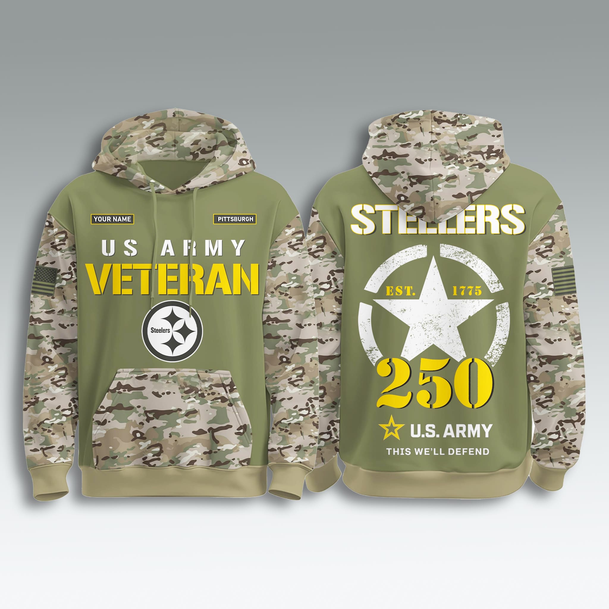 Show your commitment to the nation and the team. Don’t wait to secure this commemorative edition. Order your personalized Steelers 250th Anniversary US Army Veteran Hoodie today and salute the service in true Steeler style!