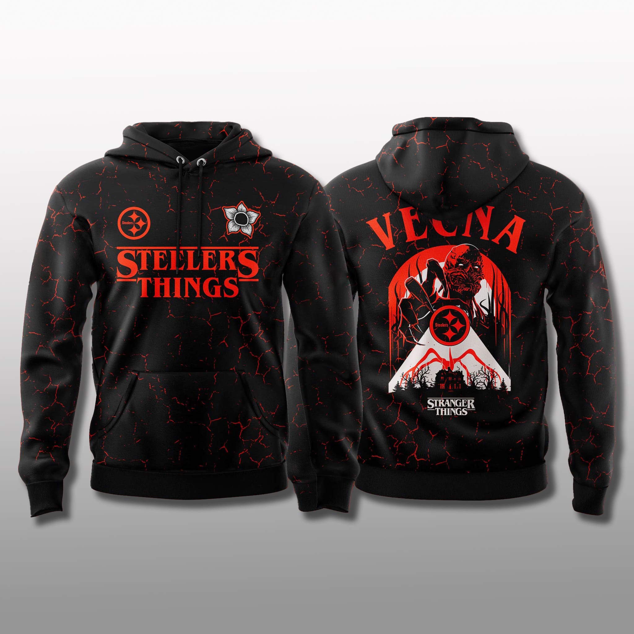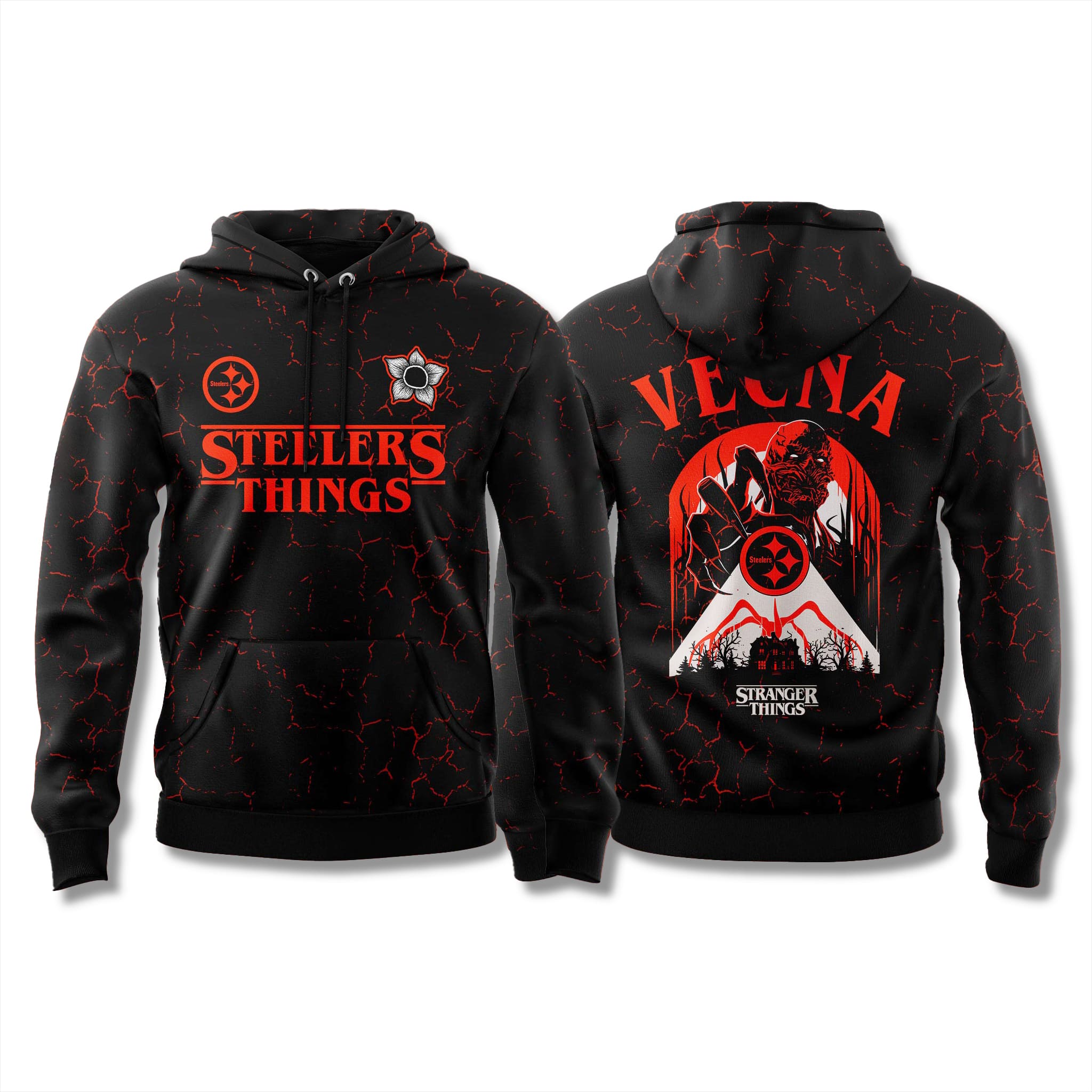 The hoodie features a deep black base, accented with fiery red crack patterns reminiscent of molten lava, evoking the tense and ominous atmosphere of the Upside Down. The standout visuals include a haunting depiction of Vecna and a stylized Steelers logo on both the front and back, creating an unmistakable and streetwear-ready design.