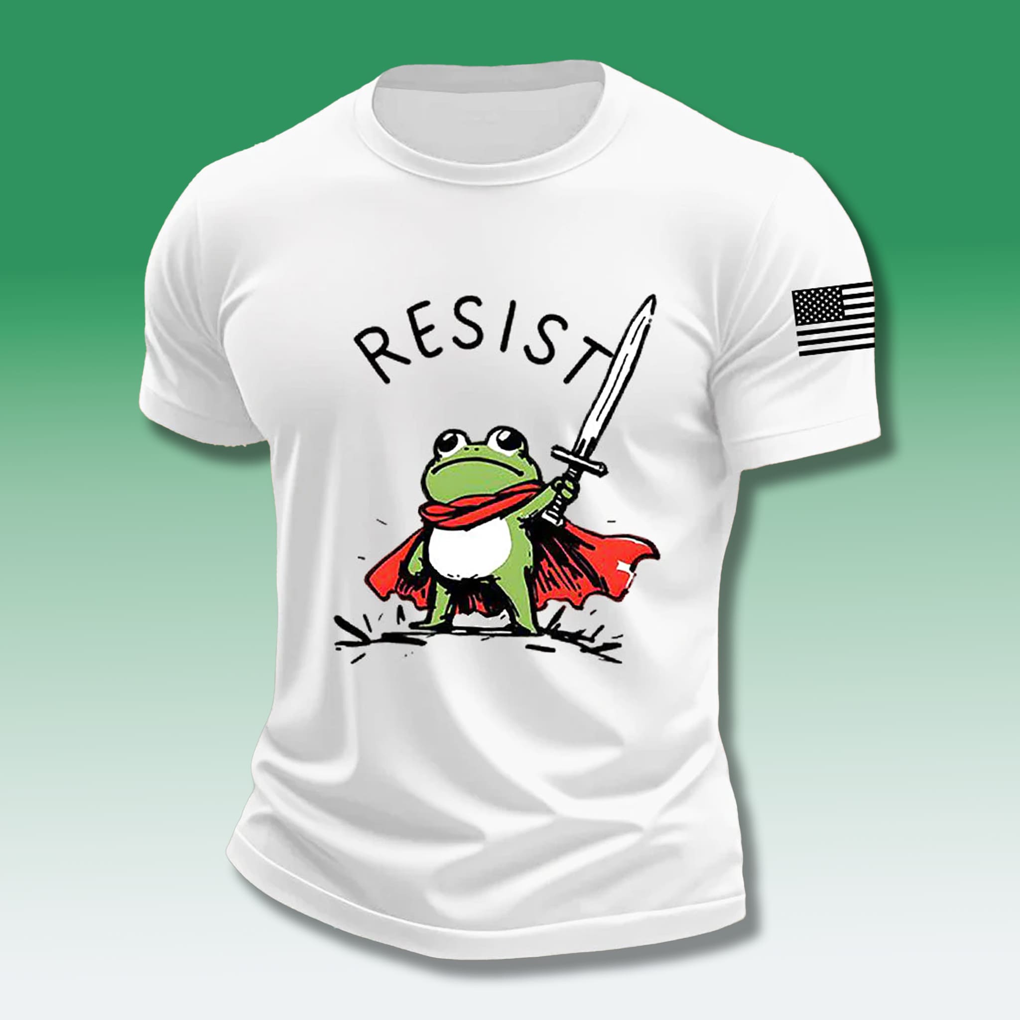 This classic Resist Frog shirt features a striking, clean design printed on a comfortable, high-quality cotton fabric. Central to the message is the powerful image of the Portland Frog, now transformed into a resolute warrior with a flowing red cape, gripping a heroic sword. The bold, upward-curving “RESIST” text emphasizes the call to action, while a subtle yet unmistakable American Flag graphic is prominently featured on the sleeve.
