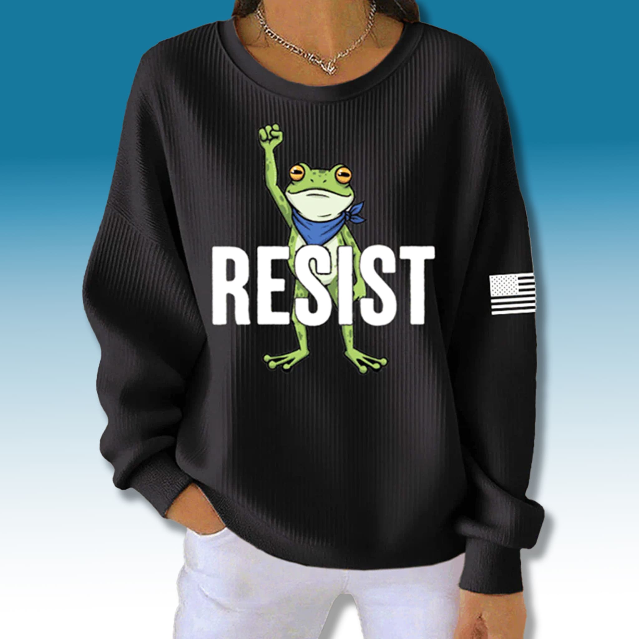 Crafted in a cozy black waffle-knit fabric for that textured, all-day hug. “RESIST” arches confidently in crisp white letters across the chest, paired with a subtle American flag patch on the sleeve—a nod to reclaiming patriotism through whimsy. Relaxed fit with drop shoulders and ribbed cuffs keeps it effortlessly chic for rallies, coffee runs, or meme-scrolling sessions.