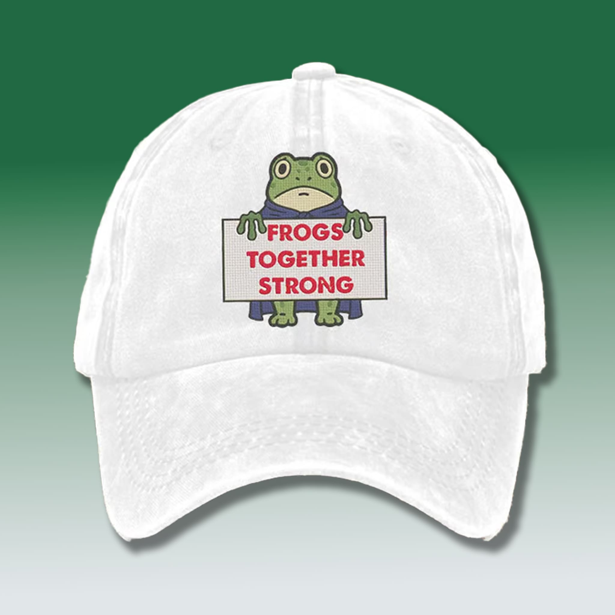 Join Portland’s peaceful uprising with the Portland Frog Together Strong Hat, a tattered denim hat that represents the Frog Brigade’s unwavering solidarity during the October 2025 ICE protests. Inspired by Seth Todd’s tear gas-resistant inflatable frog suit—now a viral symbol of resistance to federal overreach—“Frogs Together Strong” reflects the Brigade’s collective resilience slogan, transforming the meme into a movement for immigrant rights, environmental justice, and the weirdness of democracy—proving that unity triumphs division, one piece at a time.