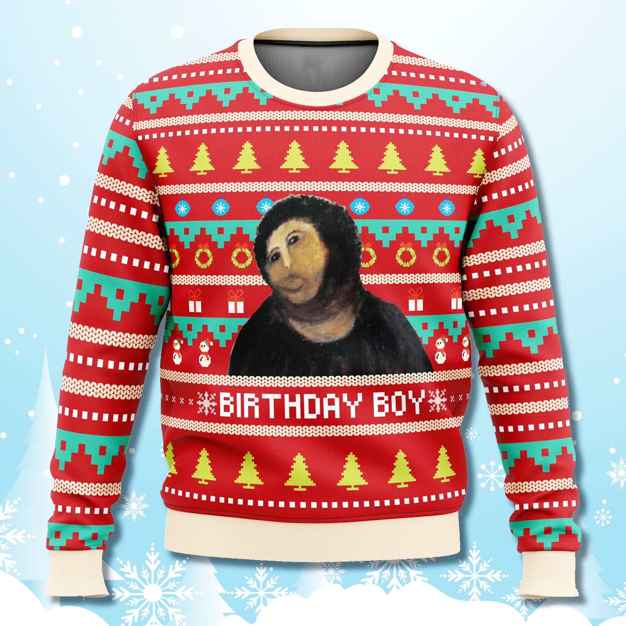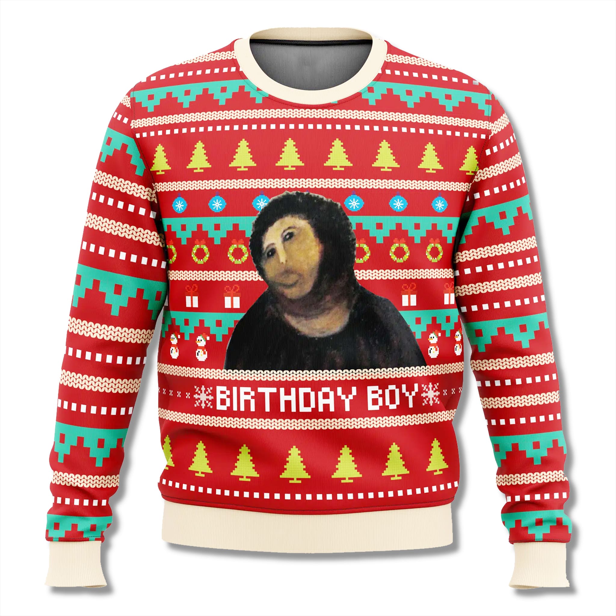 Celebrate the holidays with a touch of divine comedy and internet fame using the Potato Jesus Birthday Boy Ugly Christmas Sweater. This hilarious garment pays homage to the infamous botched restoration of the Ecce Homo fresco, affectionately known by the internet as “Monkey Jesus” or “Potato Jesus.” By labeling this unintentionally abstract masterpiece as the “BIRTHDAY BOY,” the design cleverly acknowledges the true reason for the season while poking fun at one of the most viral art moments in history.
