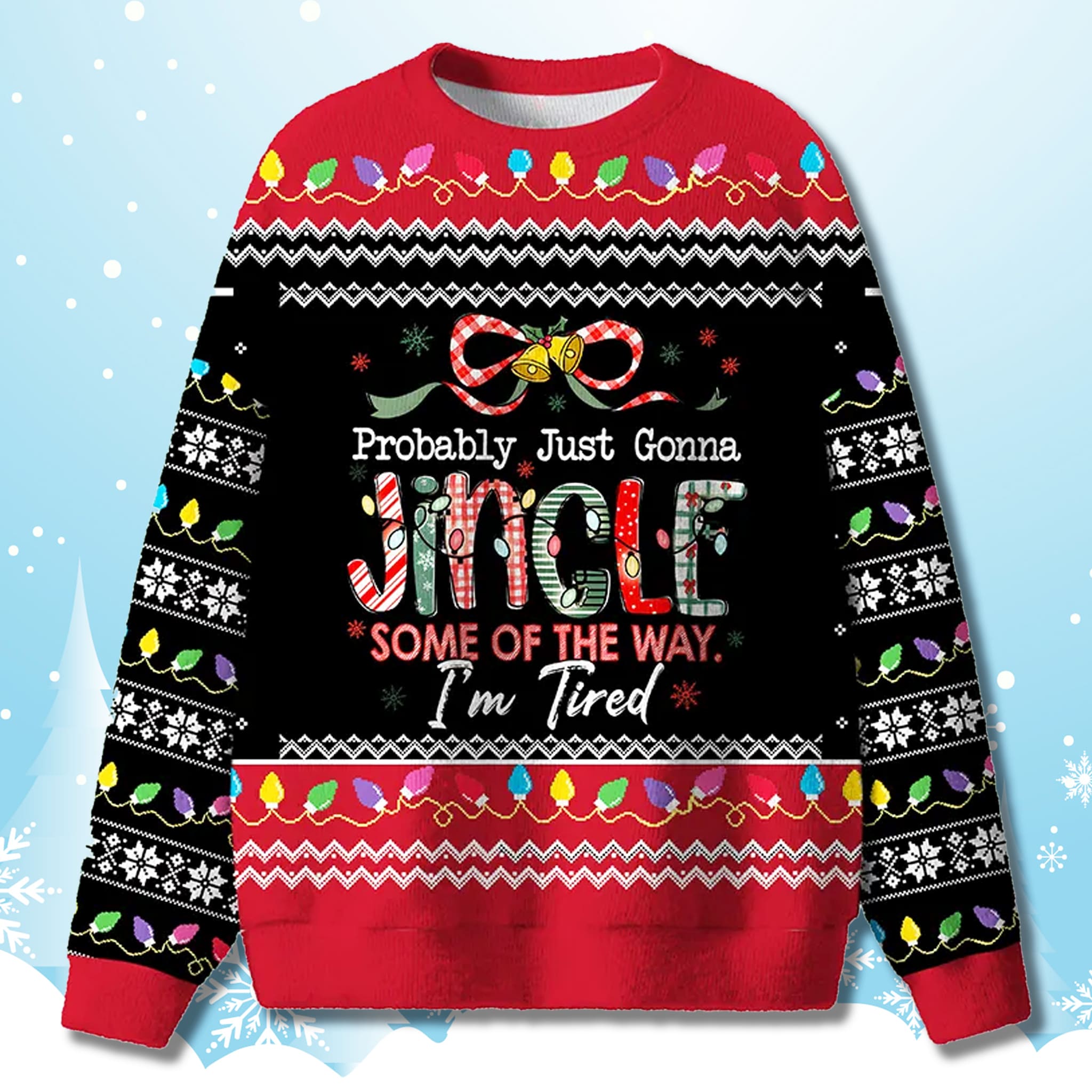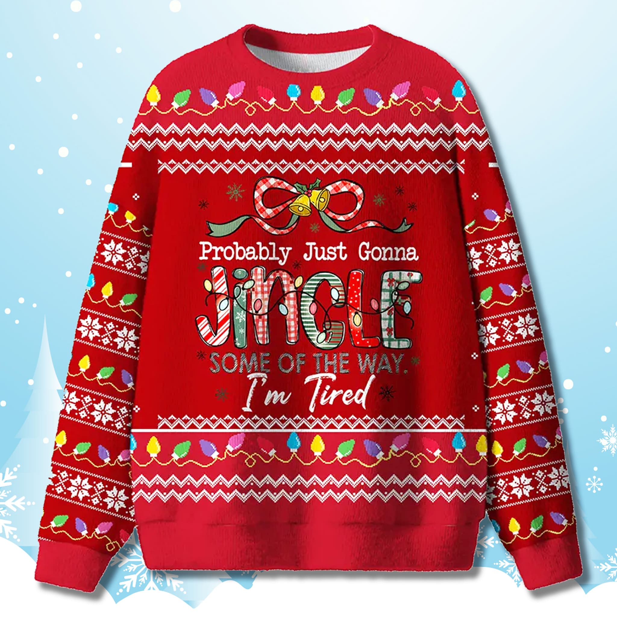 This Probably Just Gonna Jingle Some Of The Way Sweater features a vibrant bright green and festive red color palette, capturing the traditional “ugly sweater” aesthetic. The centerpiece is the funny, relatable quote “Probably Just Gonna Jingle Some Of The Way. I’m Tired,” with the word “JINGLE” uniquely decorated in various holiday patterns. The design is cheerfully finished with printed Christmas light strands and jingle bells, making it festive, funny, and refreshingly honest.