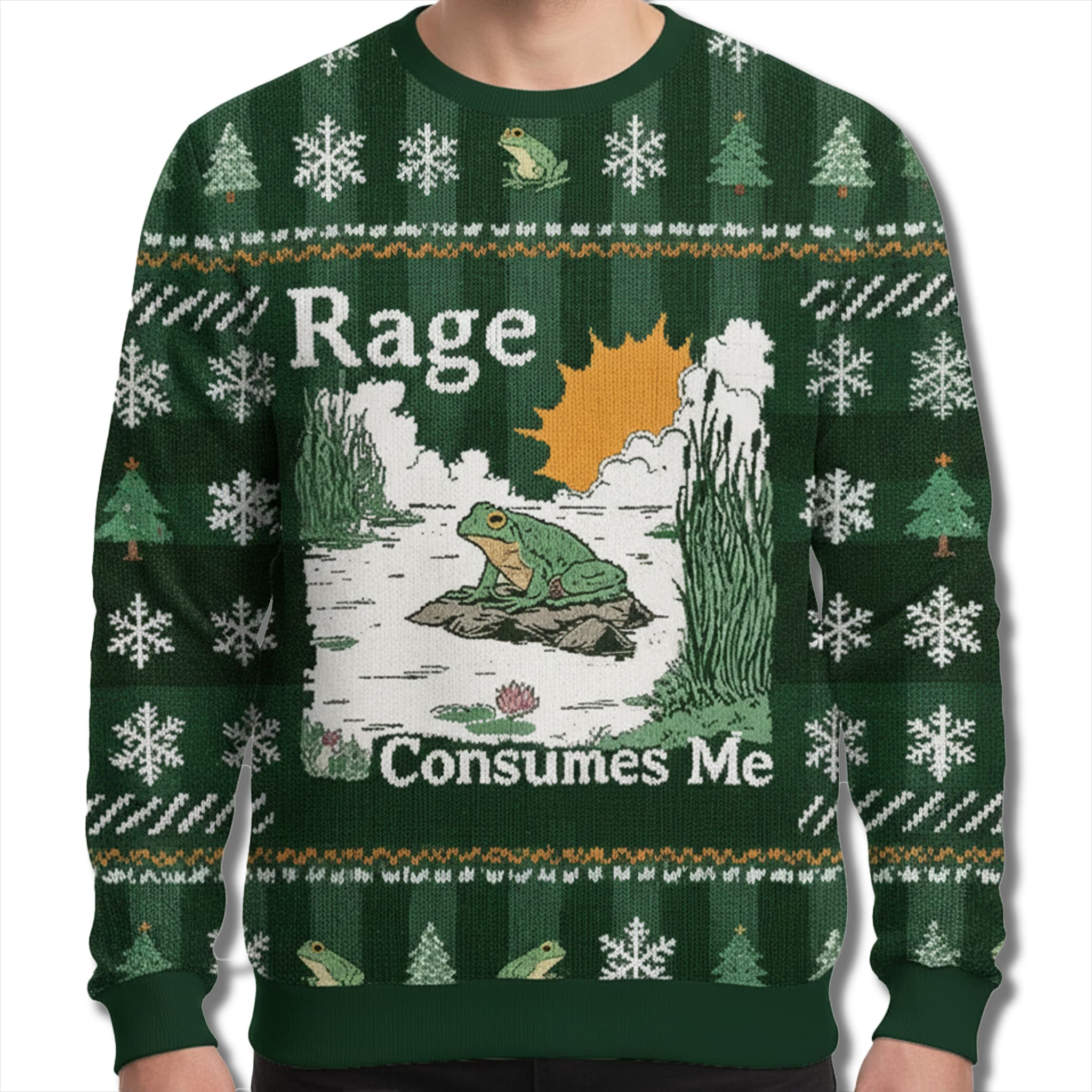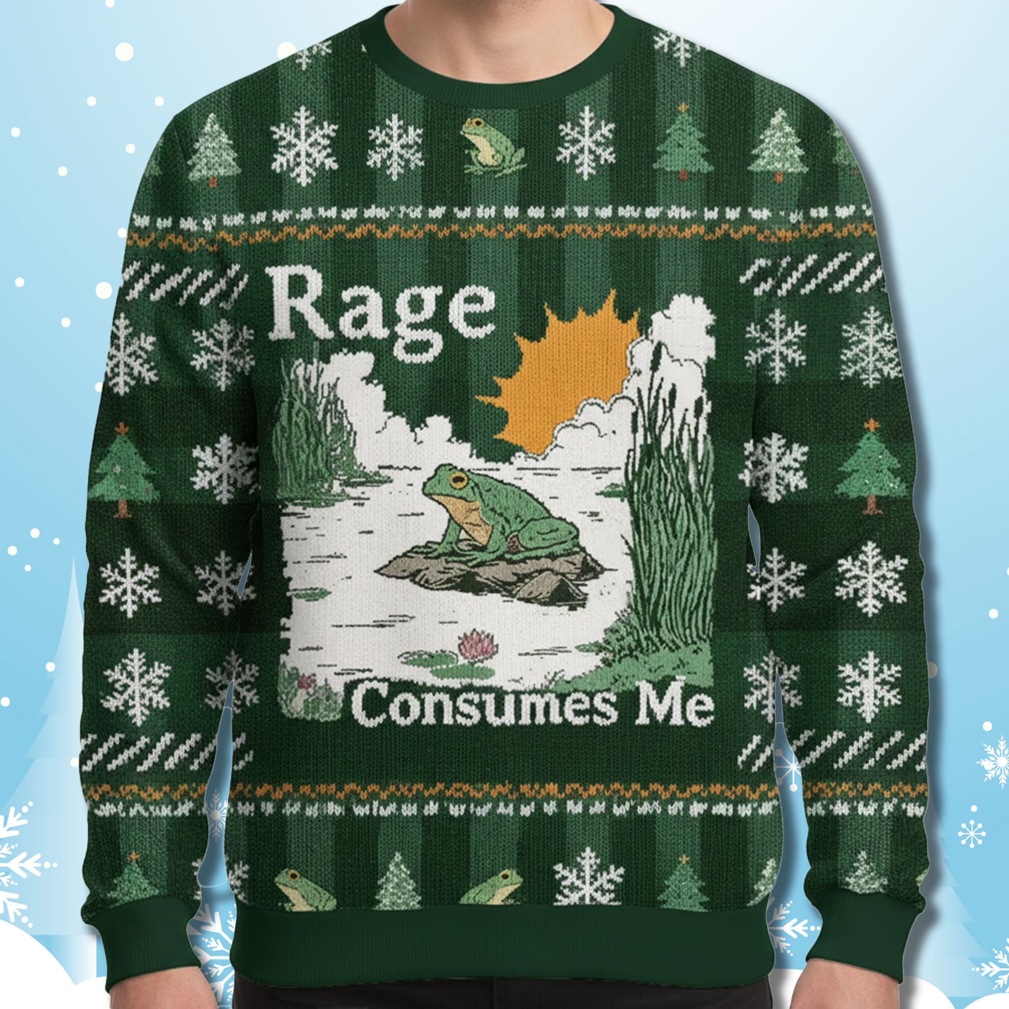 For those whose inner mood rarely matches the cheerful festive exterior, the Rage Consumes Me Frog Ugly Christmas Sweater is your perfect holiday uniform. This sweater brilliantly fuses a seemingly tranquil swamp scene with an intense, meme-worthy declaration, making it the ultimate piece of sarcastic holiday apparel. It’s ideal for meme enthusiasts and anyone who prefers a dash of ironic humor over saccharine holiday cheer.