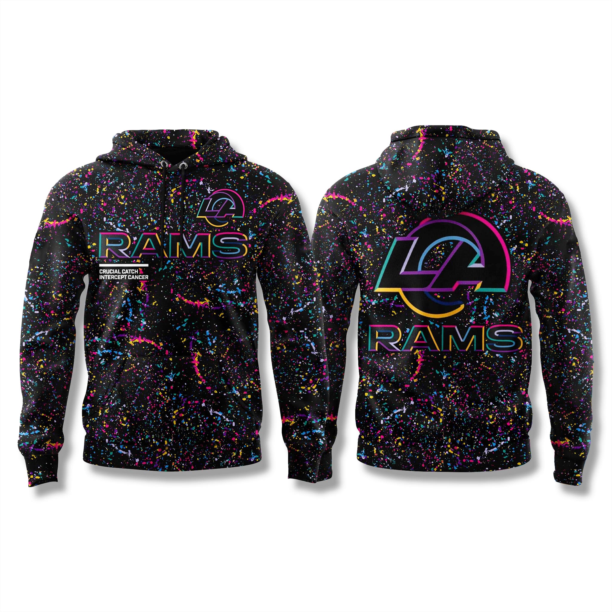 Ignite the unbreakable will of Rams Nation with the Rams Crucial Catch Hoodie 2025, a luminous beacon in the enduring Crucial Catch crusade. This year’s explosive design erupts in a nebula of neon blues, pinks, purples, and golds splashed across a deep black void—evoking the fierce storm of battle and the radiant dawn of remission, where every survivor emerges victorious like a Ram charging through the line. For the Los Angeles Rams, it’s a thunderous vow to “Intercept Cancer,” fusing the team’s relentless drive with a heartfelt embrace for warriors and families.