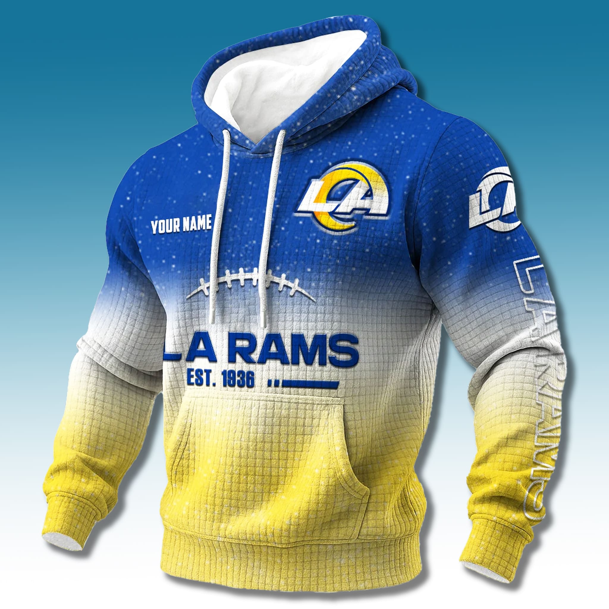 This Rams hoodie stands out with a striking blend of Royal Blue and Sol Gold, set against a unique 3D waffle-textured background. The smooth gradient transition from darker to lighter tones creates a youthful, energetic look that perfectly reflects the dynamic spirit of Rams fans.
