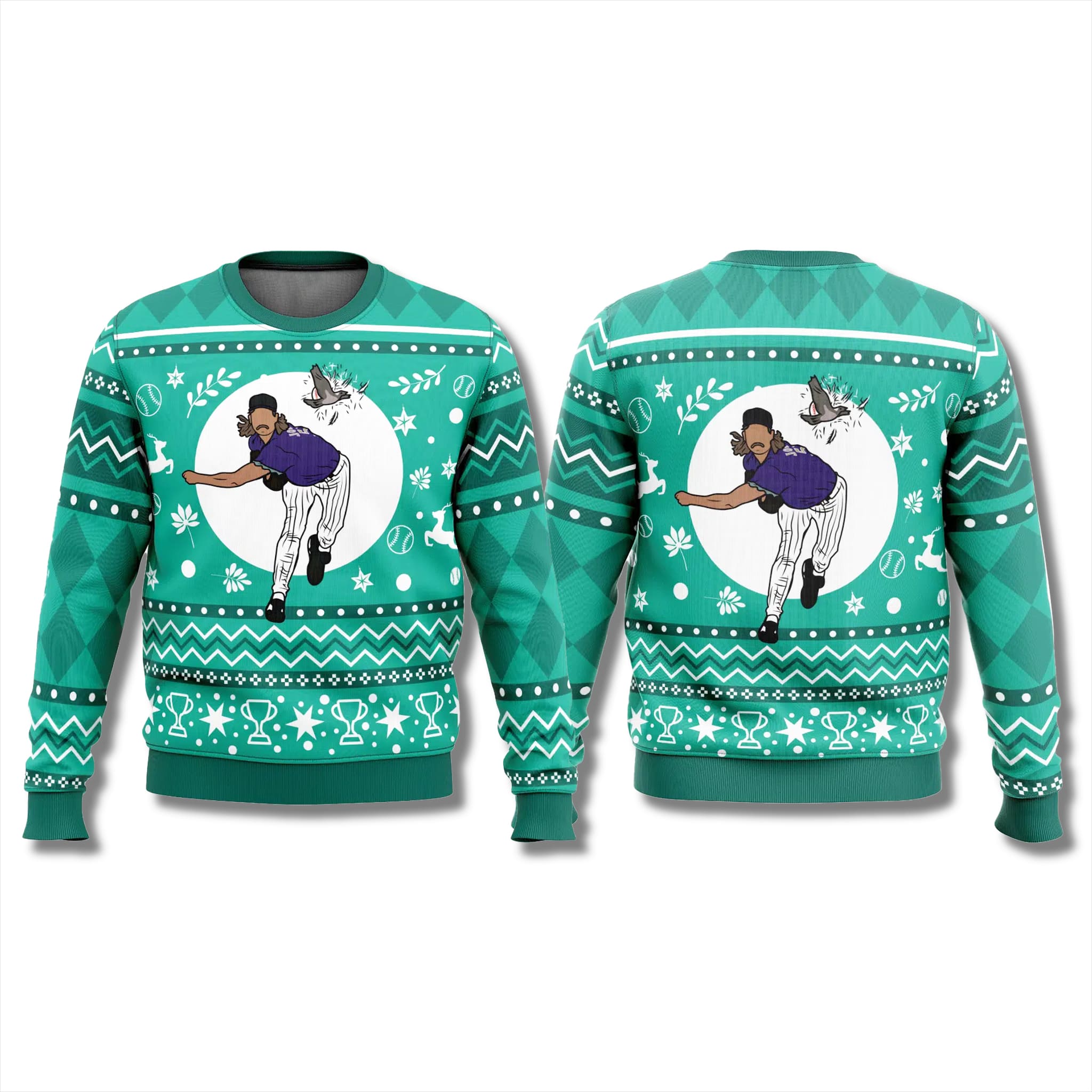 The Randy Johnson Hits Sweater features a vibrant teal and green color scheme, blending festive cheer with a sporty vibe. The centerpiece is a detailed illustration of the pitcher delivering the fastball and the “feather explosion” moment, surrounded by holiday-themed baseballs, snowflakes, and trophy icons.