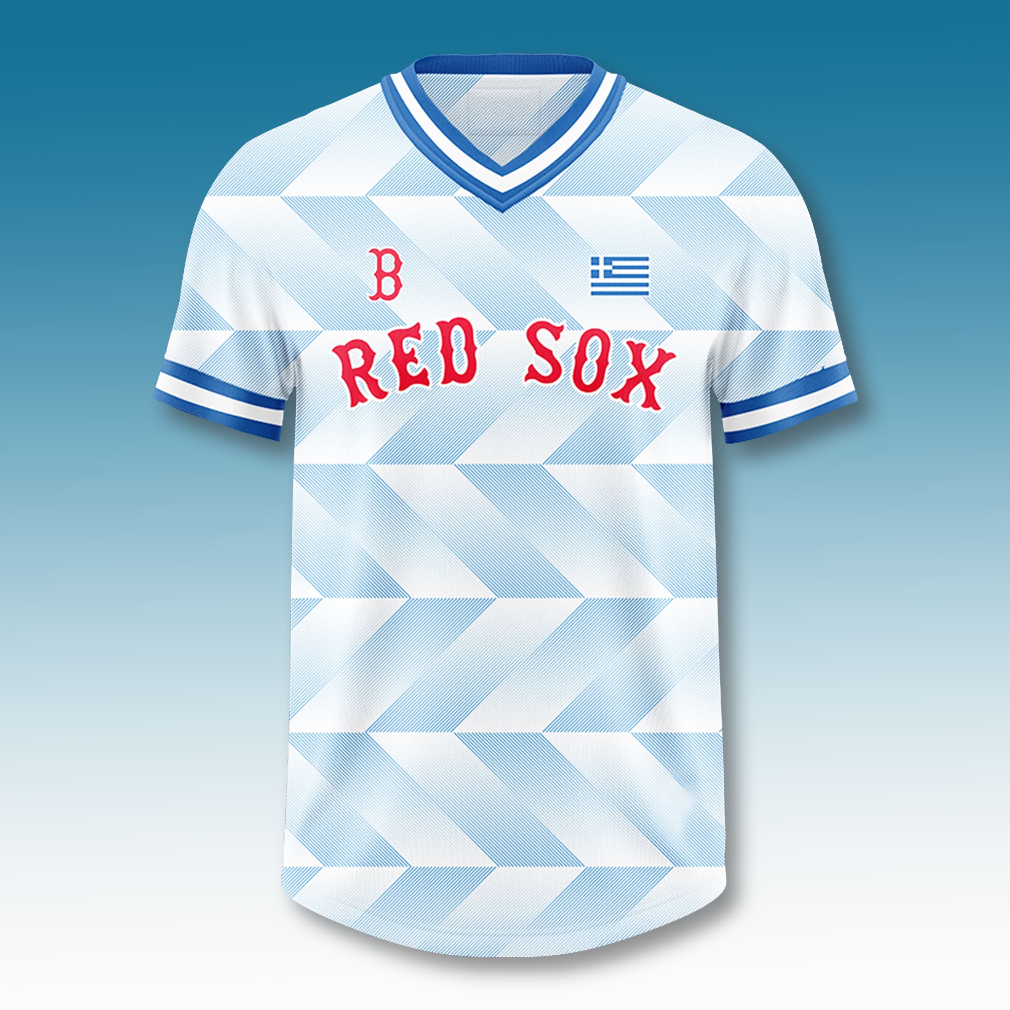 This jersey features a striking design that harmoniously blends Greek culture with Red Sox spirit: a white and light blue base with a zig-zag pattern inspired by traditional Greek motifs, a bold “RED SOX” wordmark in bright red classic script across the chest, and a small red “B” on the left chest accompanied by the Greek flag. The blue-and-white collar and sleeve trim create a strong sense of pride, honoring Greek heritage while fully preserving the spirit of the Boston Red Sox – a perfect fusion of culture and sport.