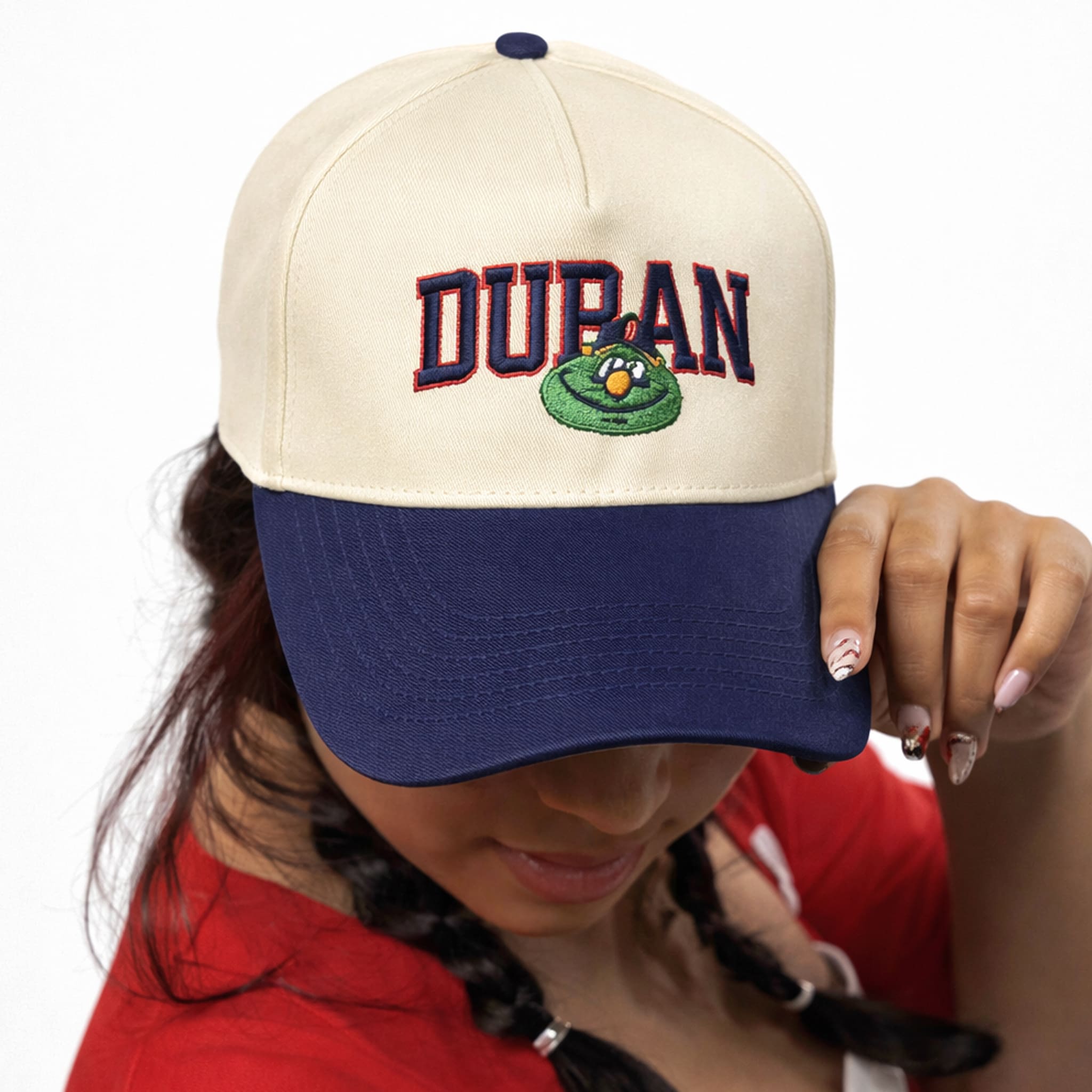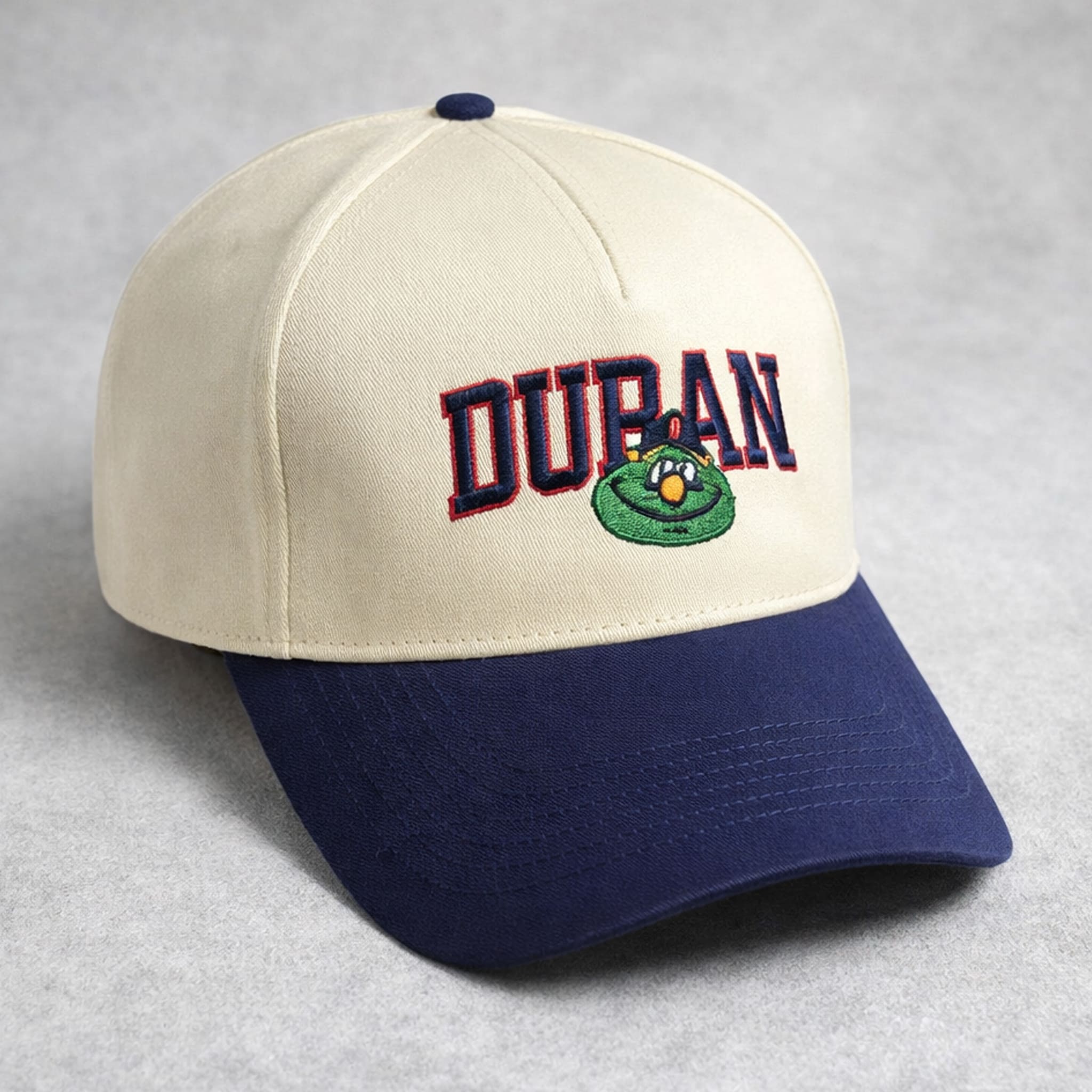 This hat is currently available at iFrogtees, featuring a classic retro design with a cream beige crown paired with a bold navy brim, highlighted by detailed embroidery of a cute cartoon-style Wally the Green Monster. It’s the perfect casual streetwear piece that captures the fun and legendary Fenway vibe.