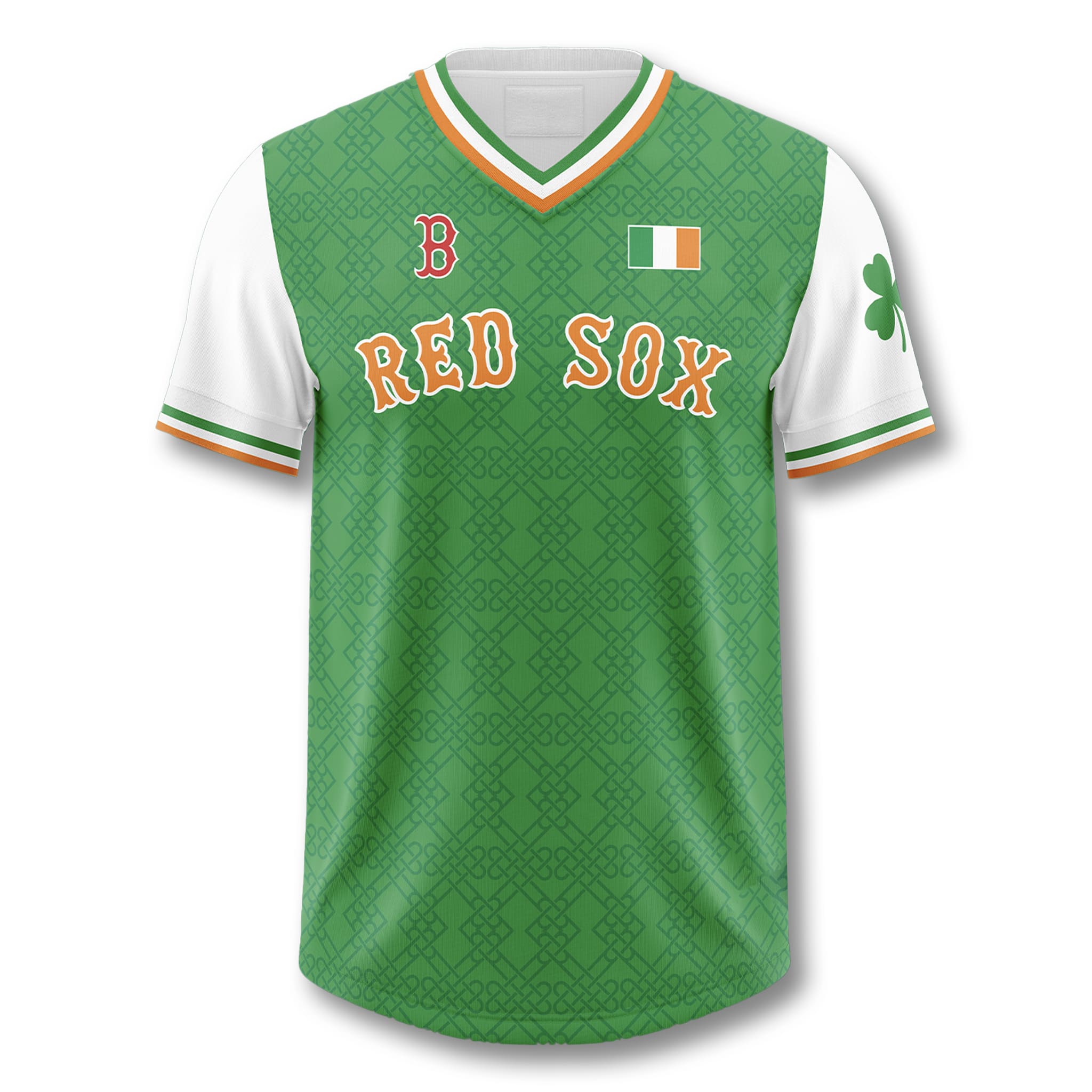 The overall jersey design reflects the beauty and pride of Irish culture: a vibrant green base featuring intricate Celtic knot patterns, a bold red “B” on the left chest, the Irish flag displayed on the right, and “RED SOX” styled in Irish-inspired typography with orange lettering outlined in white across the center. A lucky green shamrock patch appears on the right sleeve – creating a look that is both respectful, vibrant, and deeply meaningful.