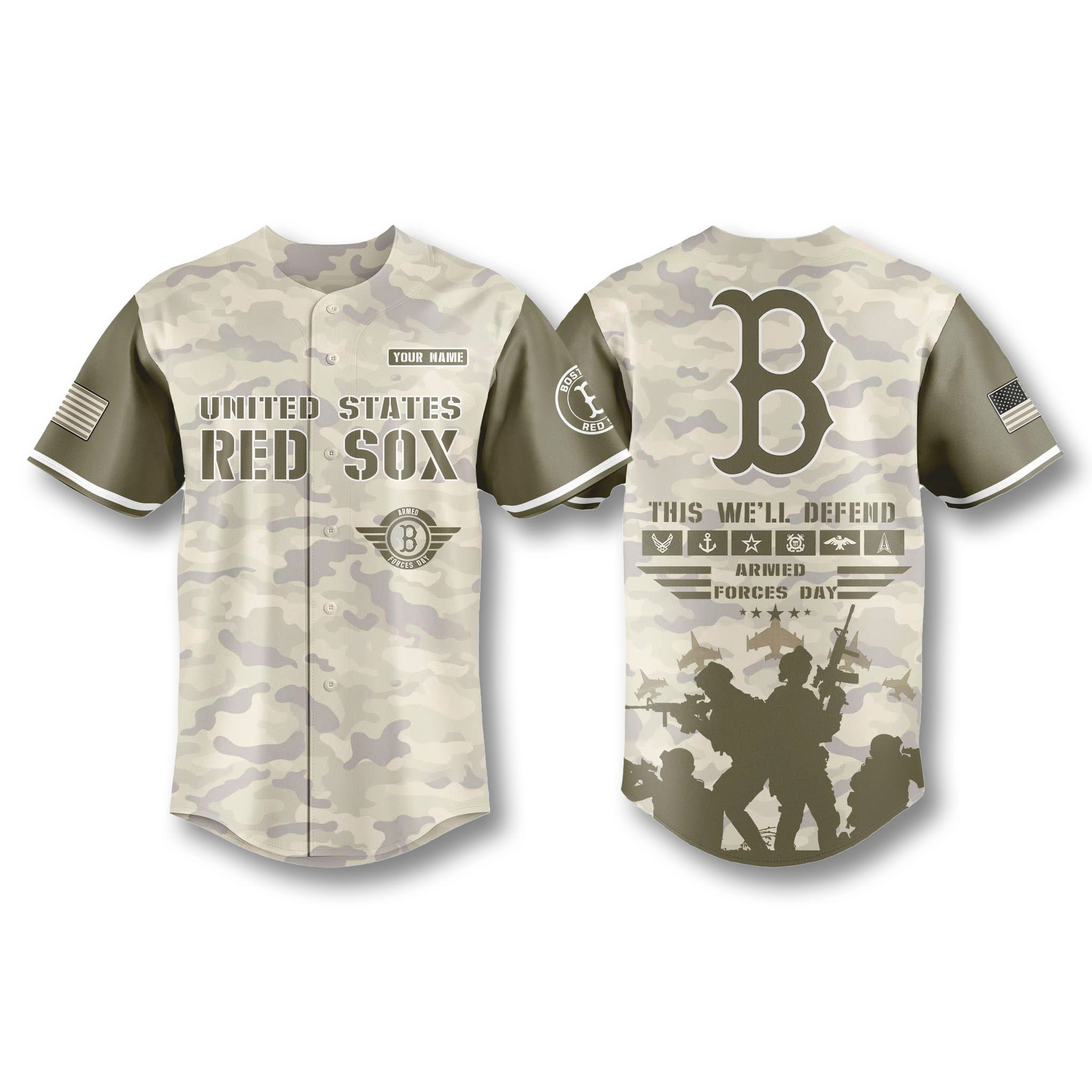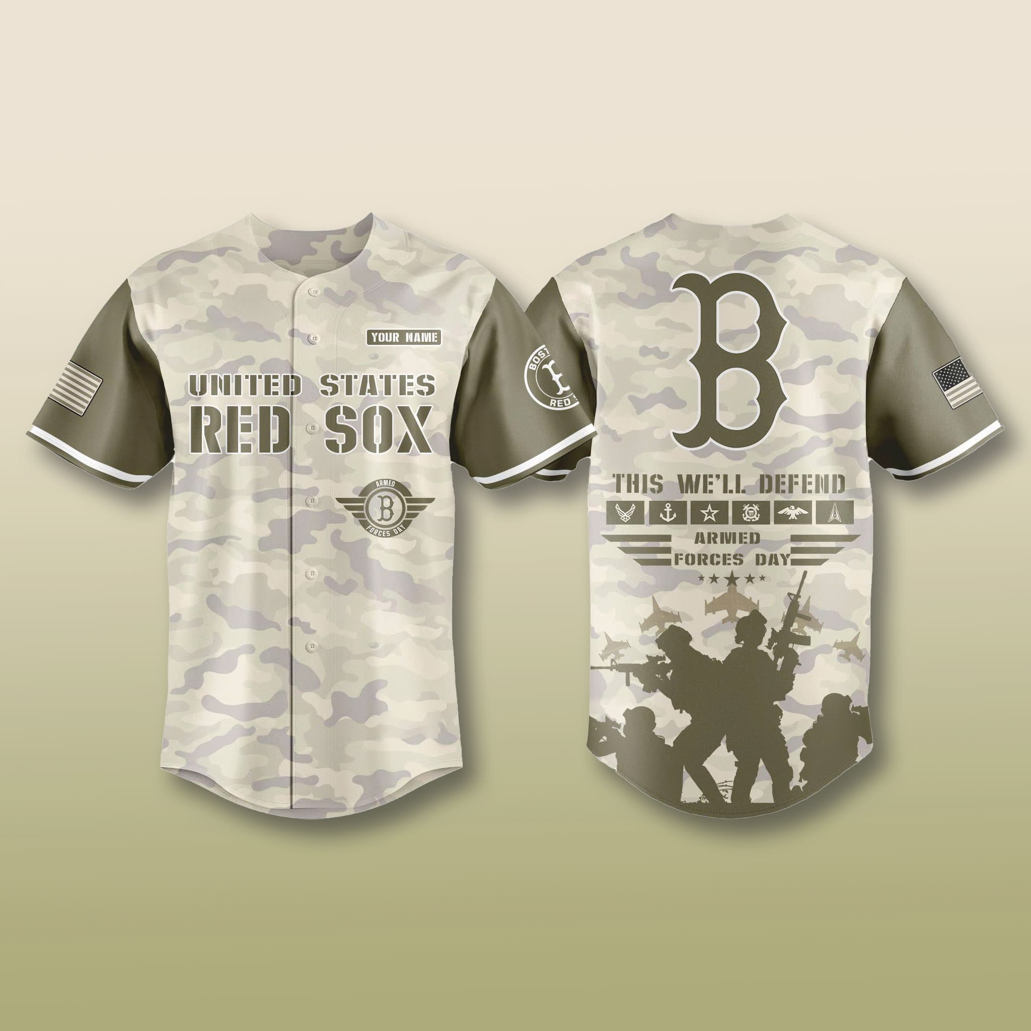 The jersey design stands out with a modern desert camo base combined with strong olive sleeves, creating a powerful and masculine look. The front features the words United States Red Sox, while the back displays the symbolic letter B logo together with the message “This We’ll Defend,” making the overall design both sporty and rich in tribute meaning.
