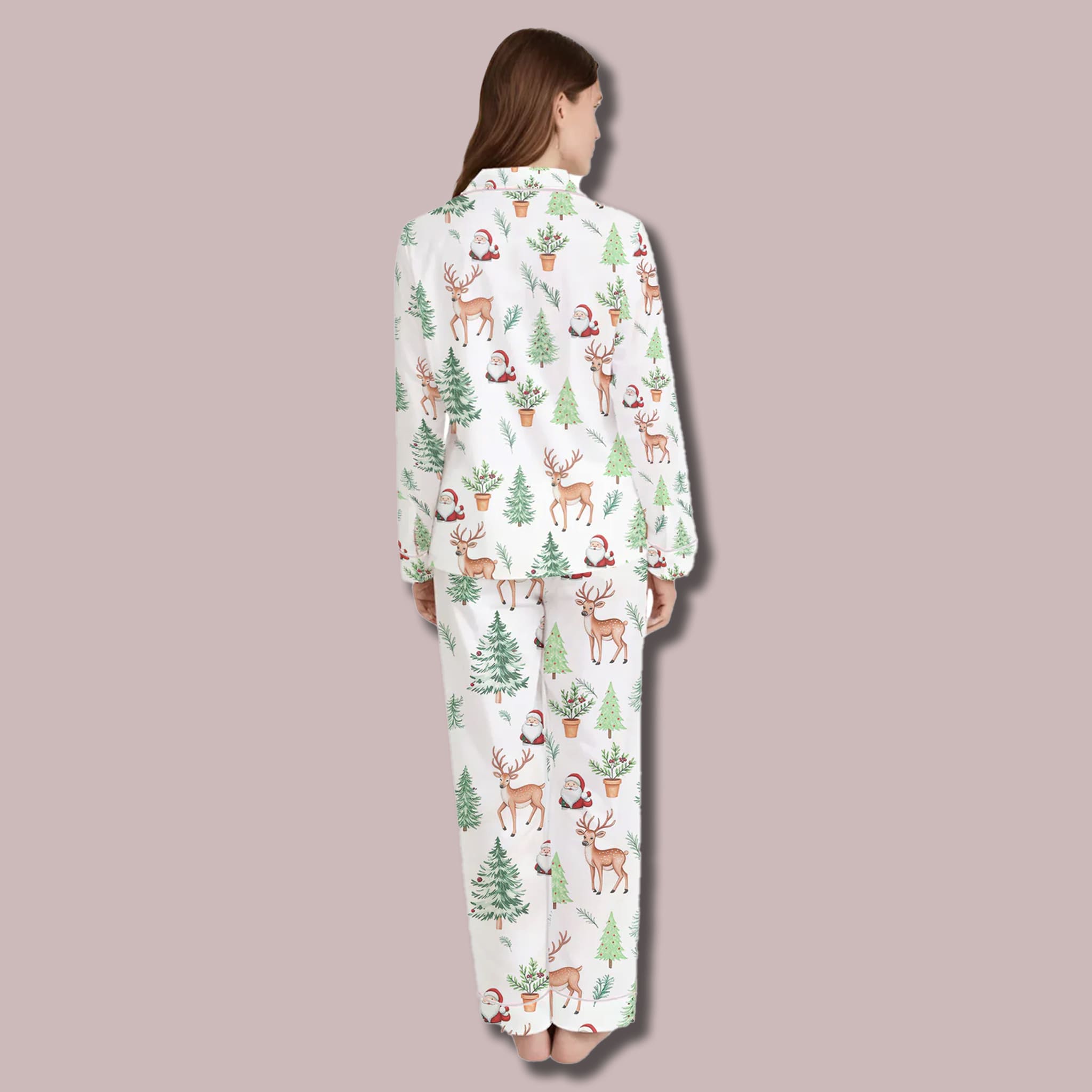 Reindeer Santa Christmas Silky Satin Pajama Set | Elegant & Festive Holiday Sleepwear