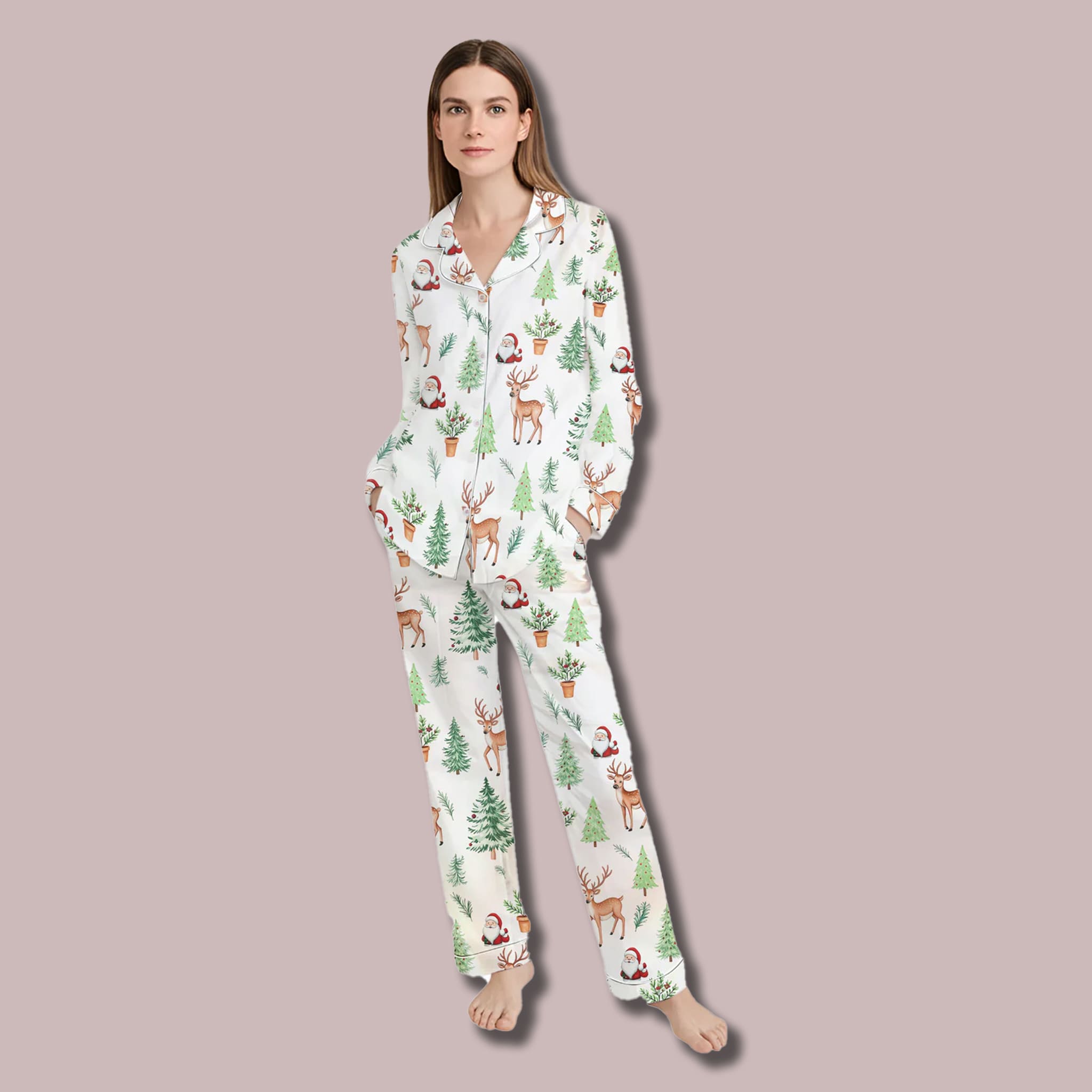 Crafted from high-quality, lightweight satin, this sleepwear glides over the skin, offering a cooling and breathable fit that ensures a restful night’s sleep. This Christmas Reindeer Santa Women’s Pajamas Set features a crisp white backdrop brought to life with a whimsical, watercolor-style pattern of graceful reindeer and cheerful Santa Claus figures. The design is accented with classic Christmas trees and botanical elements in soft greens and reds, creating a look that is both traditional and artistically modern.