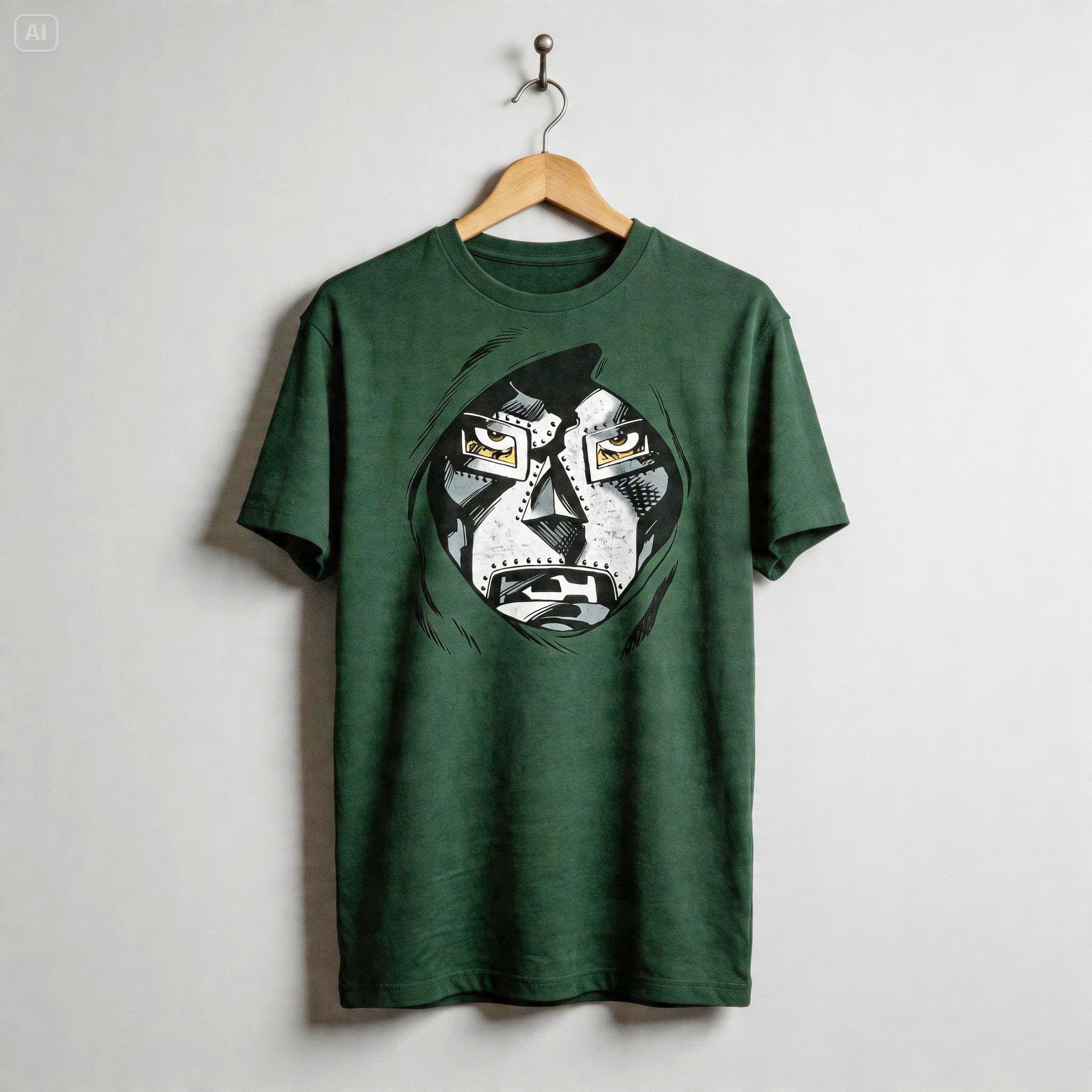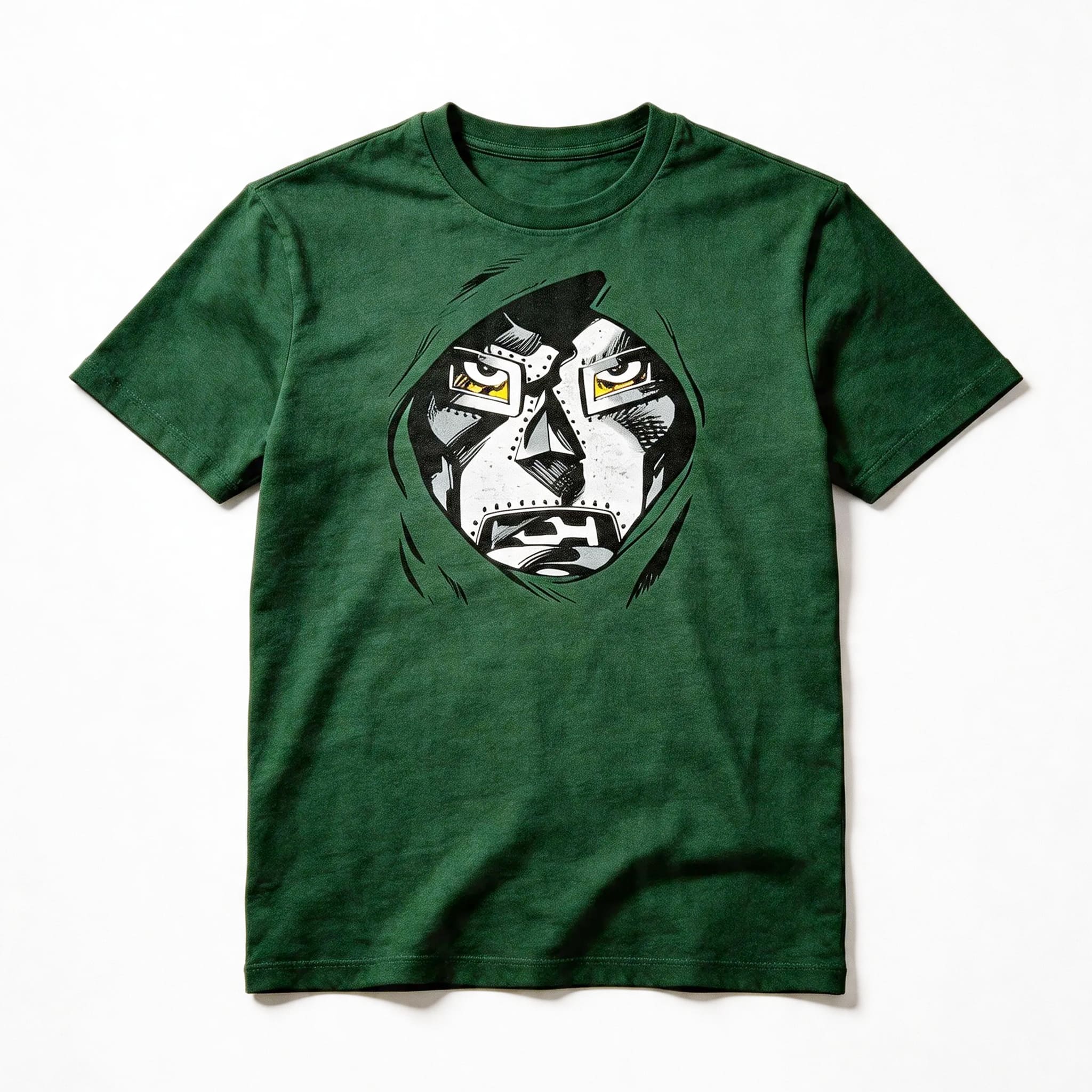 The Robert Downey Jr Doctor Doom Shirt is a bold dark green design featuring Doctor Doom (Victor von Doom) in a striking comic book style. The central graphic depicts his cold metallic face, sharp golden eyes, and an arrogant, powerful expression, standing out against the green background – the signature color of Doom’s cloak.