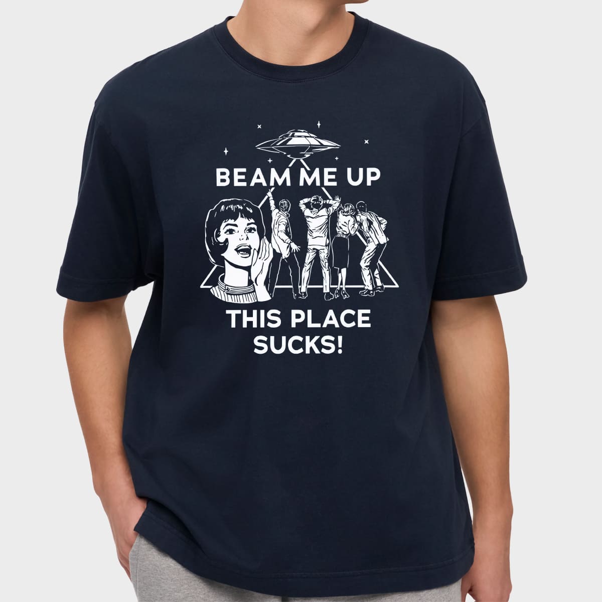 Add some humor and cinematic flair to your wardrobe. Get the Stranger Things Beam Me Up This Place Sucks Sweatshirt to express your personality and find kindred spirits in the Stranger Things “universe” today!