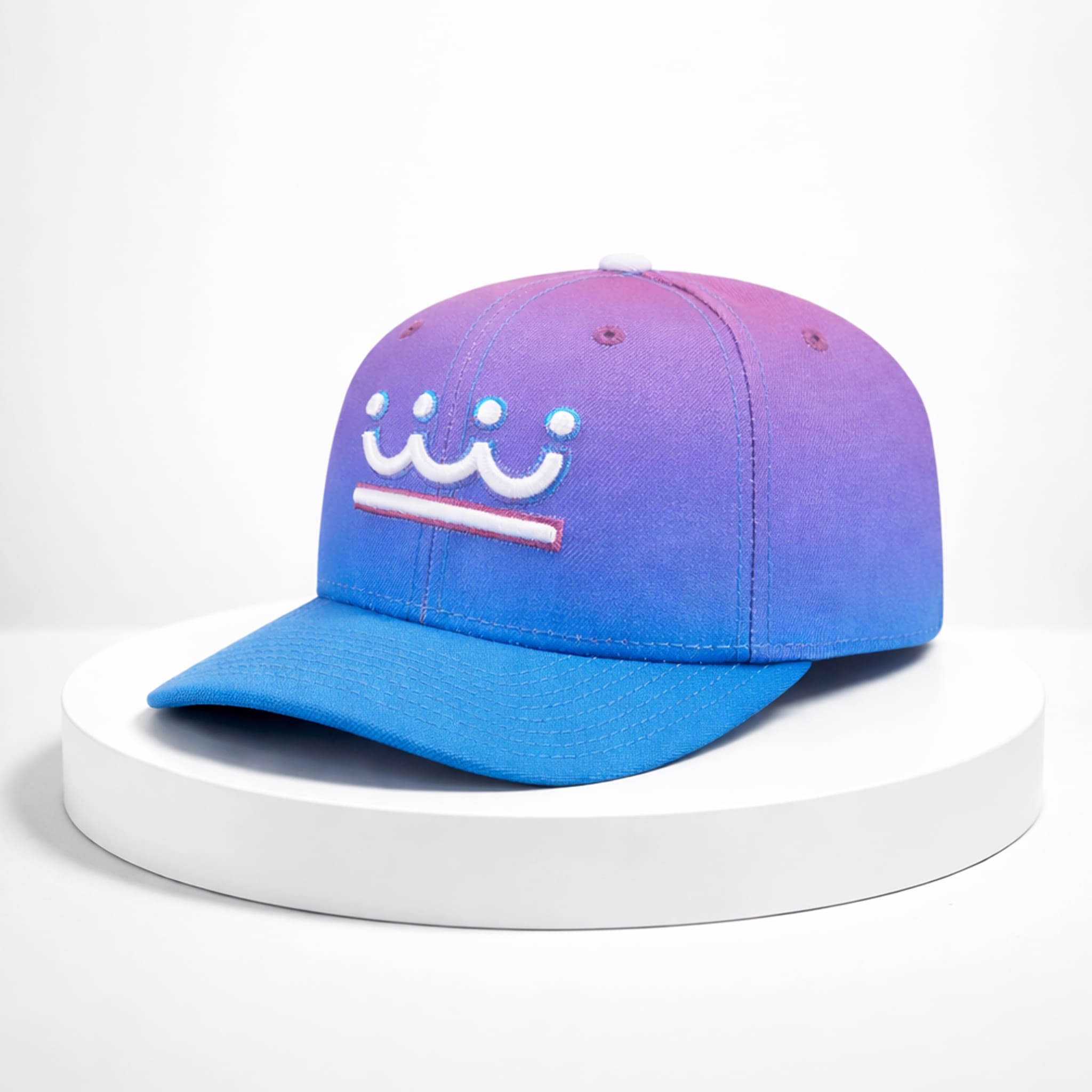 The crown starts with a vivid fuchsia tone, smoothly transitioning through purple and blending into a clean royal blue on the brim – creating a seamless and eye-catching gradient. The front features a raised white crown logo inspired by the original Royals emblem from 1969, symbolizing both tradition and a new era for the team. This is the perfect piece for those who love to stand out – loyal Royals fans or streetwear enthusiasts looking for a unique gradient item to complete their outfit.
