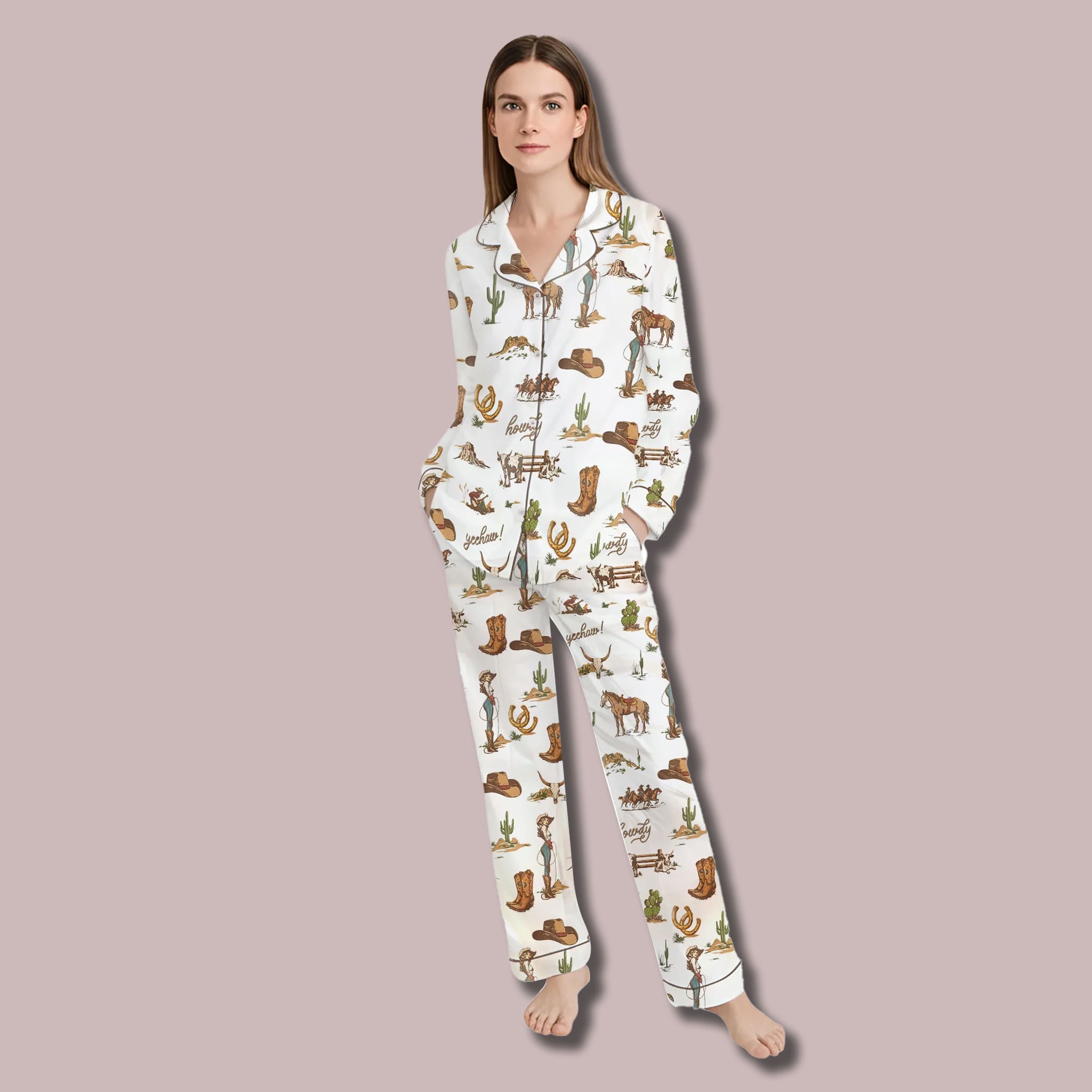 This eye-catching Rustic Americana Cowboy Women’s Pajama Set features a nostalgic, sketch-style all-over print on a crisp white background, showcasing iconic Western motifs like galloping horses, cacti, cowboy boots, and longhorn skulls. The design is playfully accented with “Howdy” and “Yeehaw” typography in earthy tones and finished with elegant brown contrast piping, creating a look that is both vintage and trendy.