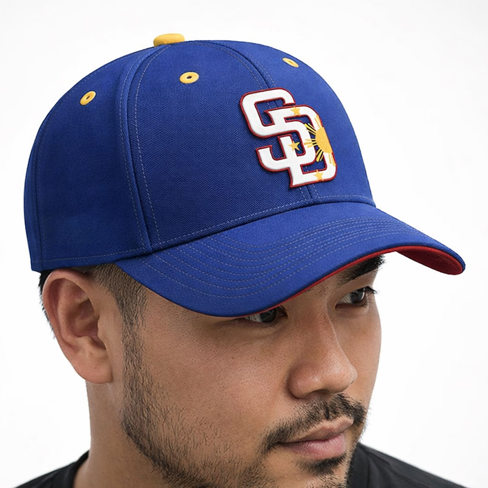 This hat features a premium snapback design with a deep navy-blue crown paired with a gold brim, creating a bold and energetic contrast. On the front, a large embroidered “SD” logo in gold is accented with the sun emblem and three stars. The side panel includes a subtle Philippine flag detail, symbolizing strength, hope, and the proud heritage of the Filipino community.