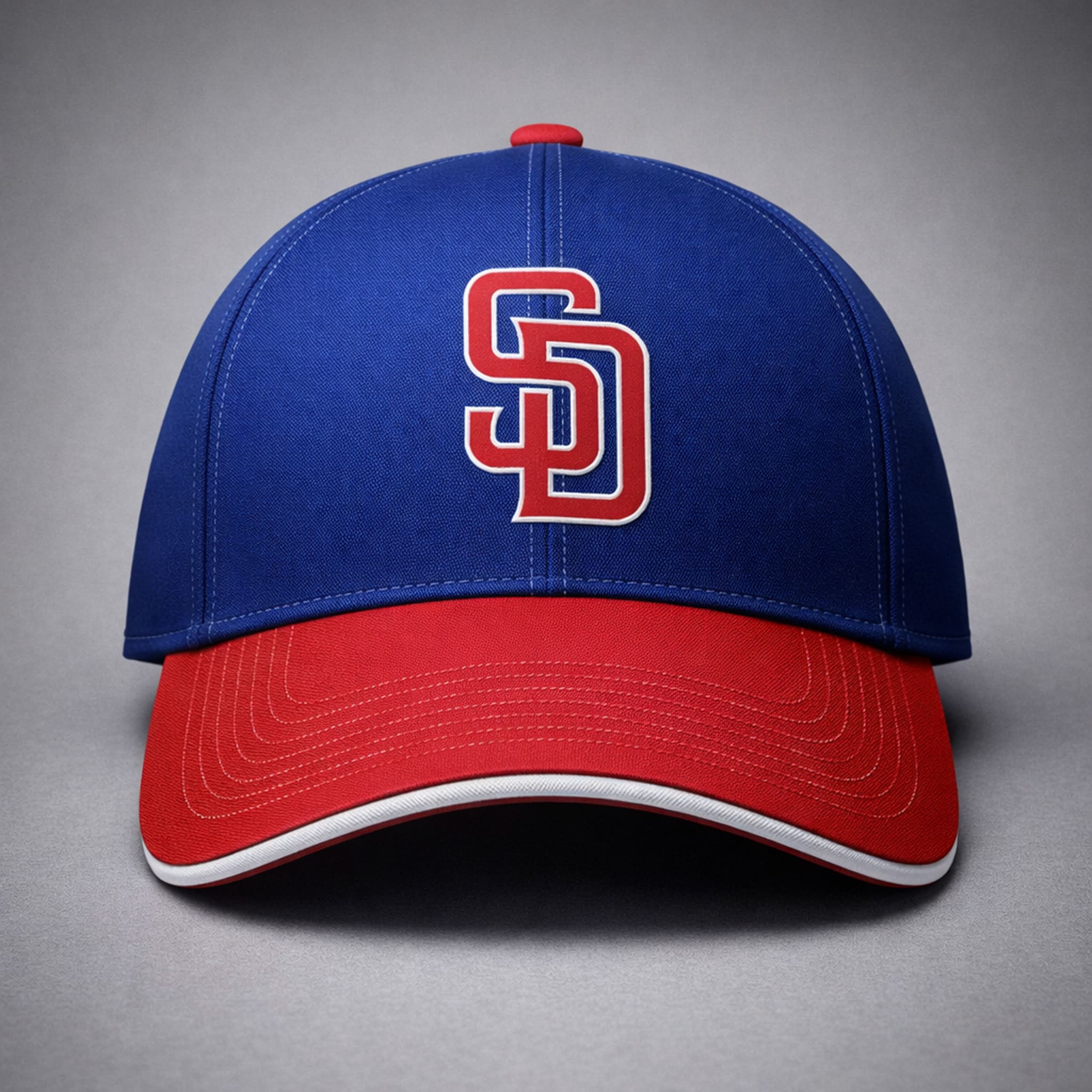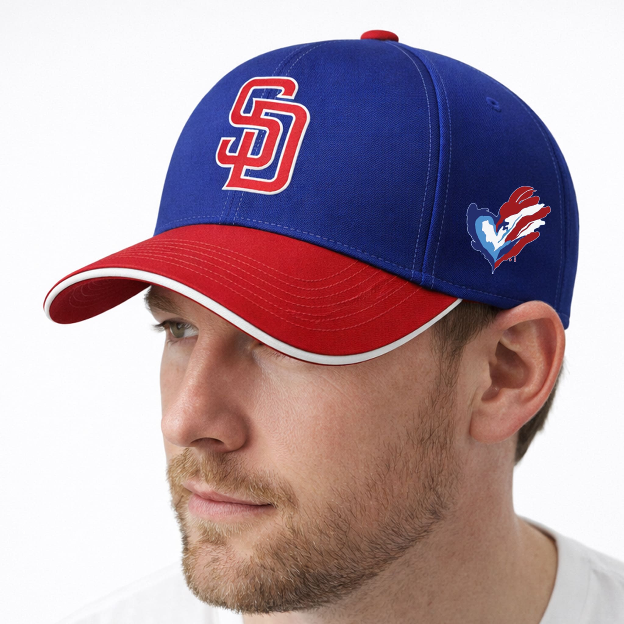 This hat features a premium structured cap design with a deep navy-blue crown paired with a vibrant red brim, creating a bold and energetic contrast. The front showcases a large embroidered “SD” logo in red with a white outline, while the right side features a heart emblem in the colors of the Puerto Rican flag – a symbol representing pride, unity, and the rich heritage of Puerto Rico. The overall design blends modern style with cultural symbolism, making it perfect for showing Padres pride and Puerto Rican heritage anywhere – from the stadium to family gatherings.