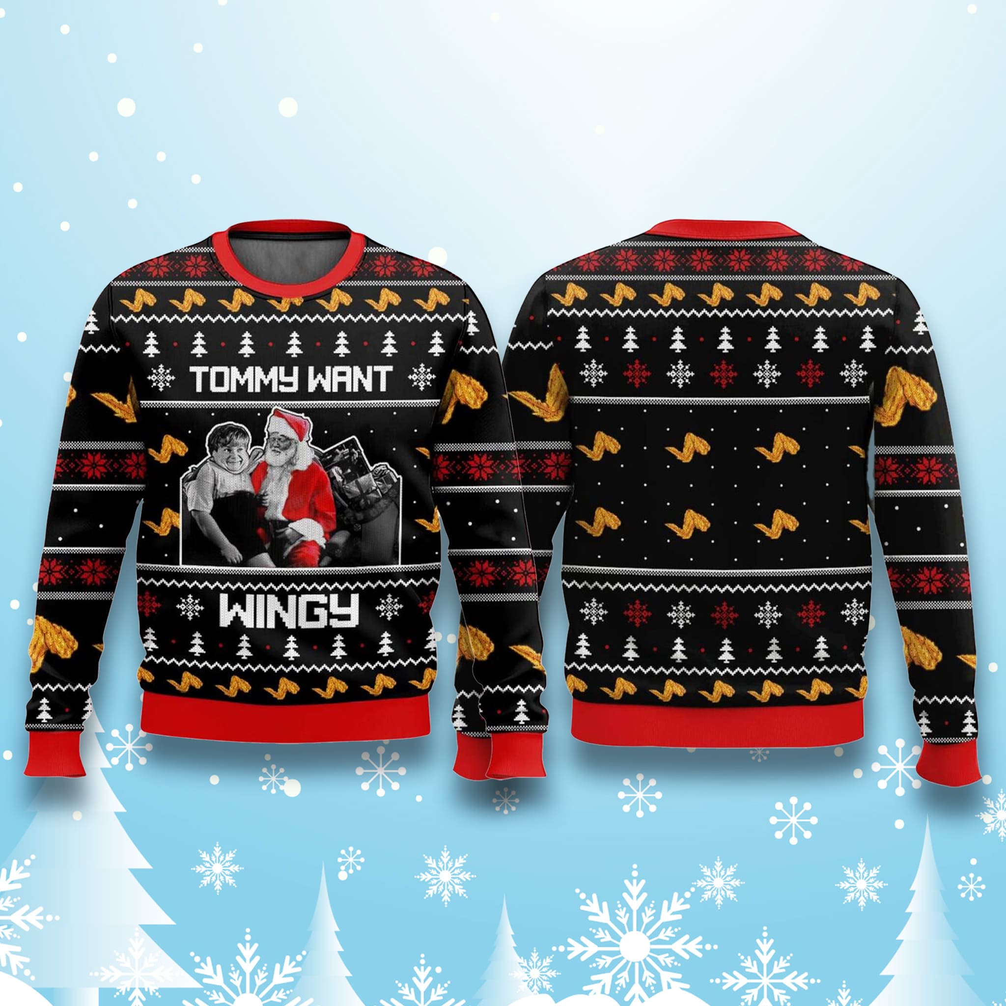 This Tommy Want Wingy Ugly Sweater features a classic, eye-catching black and red Ugly Sweater style pattern. The front proudly displays a comical, festive image of “Tommy” on Santa’s lap, a clear nod to the humor of Tommy Boy and the general Christmas atmosphere, along with the iconic phrase “TOMMY WANT WINGY”. The entire garment is sprinkled with festive elements like snowflakes, geometric patterns, and, a repeating pattern of golden chicken wings across the front, back, and sleeves, perfectly tying.