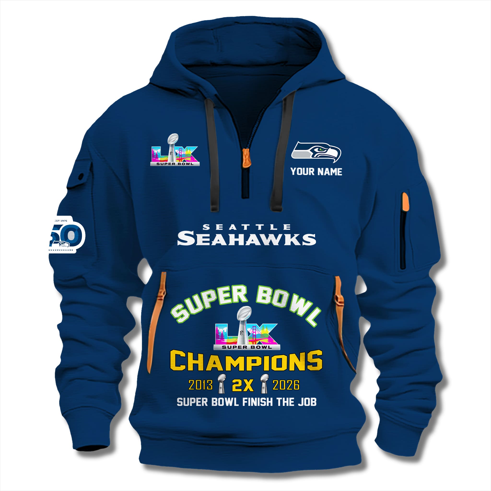 The Seahawks 2025 Super Bowl Champions Quarter Zip Hoodie is a design made specifically for loyal 12s fans who believed from the start of the season and are now waiting for the moment the team lifts the Lombardi Trophy for the second time. With its signature deep navy blue color, this hoodie delivers a clear message: “SUPER BOWL CHAMPIONS” alongside the vibrant Super Bowl LX logo, combined with the “2X” detail and the years 2025–2026. This is a practical hoodie to wear while watching the game, celebrating with friends, or carrying Seahawks spirit with you anytime, anywhere.