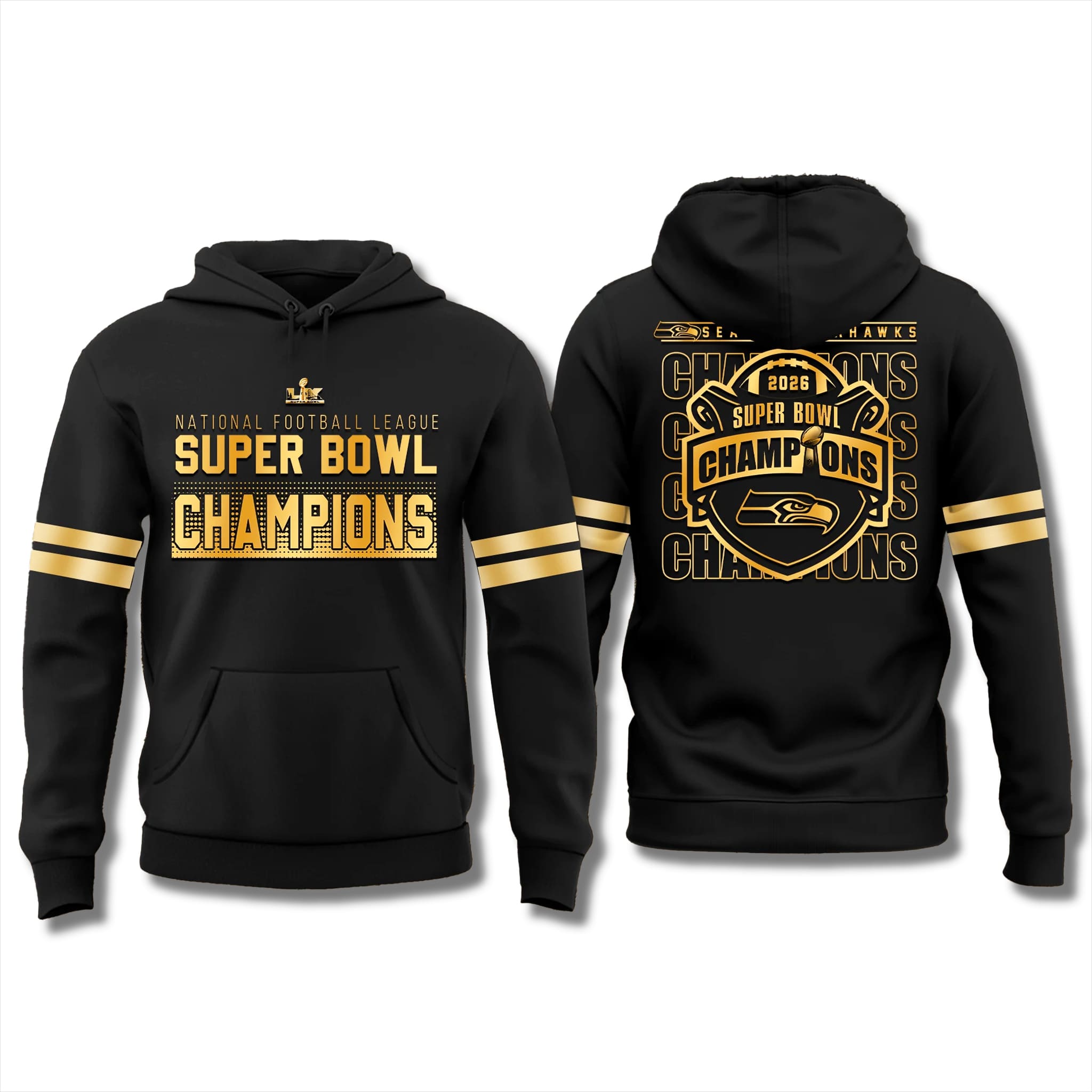 This hoodie features a bold black base accented with luxurious gold details. The Seahawks logo and the Super Bowl Champions 2026 emblem are prominently printed, creating a powerful, modern look designed especially for the legendary 12s fanbase.